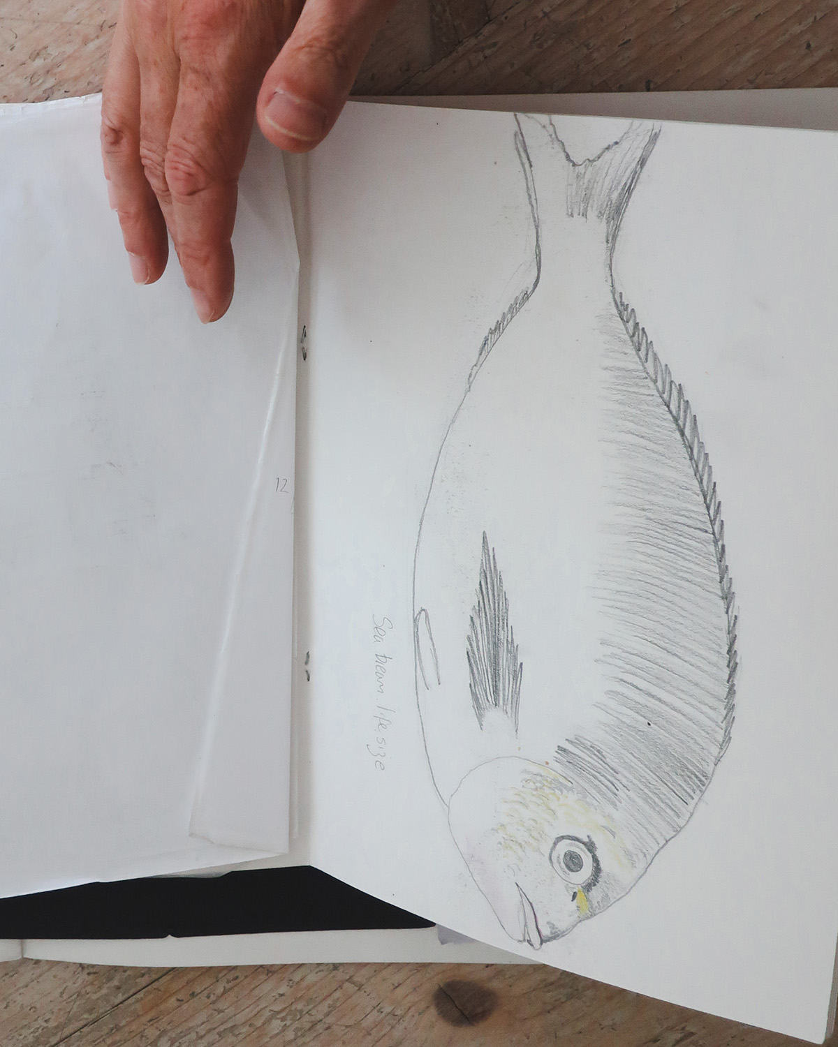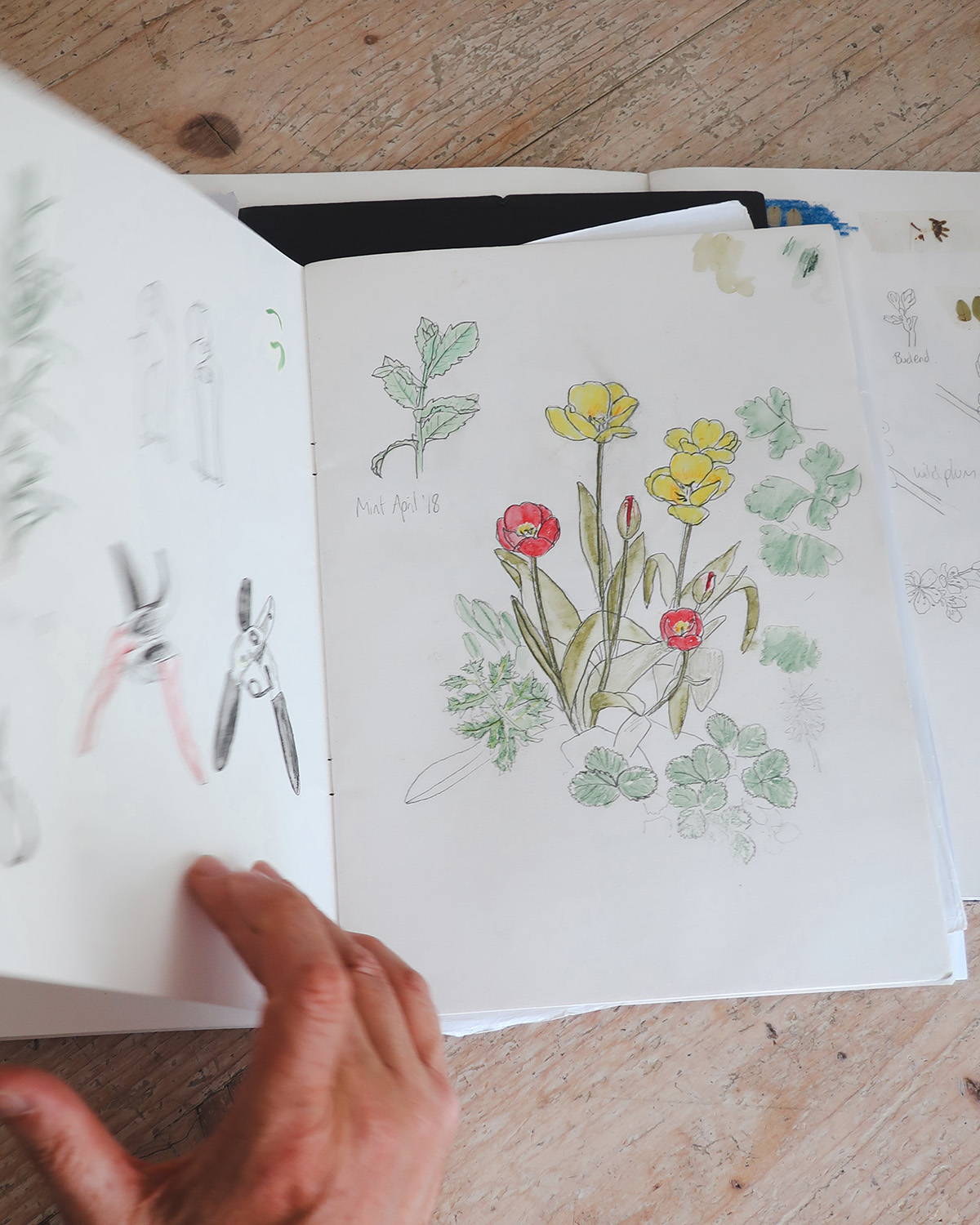 一冊は、いつも持ち歩くもの。旅先でも、妻が読書している傍らでスケッチするのが好きで、僕にとってはメディテーションのような時間です。ガーデニングの道具、押し花、葉っぱ、魚のスケッチ、レシピまで、僕の日常が全部詰まっている。最近では、自然の中で見つけたホップをスケッチして(新鮮なホップはすごく美味しいんです)、その先端を夕食のパスタ用に摘んで帰ることも。僕にとっては料理もジュエリーも、“ひと続きの生活の営み”なんです。