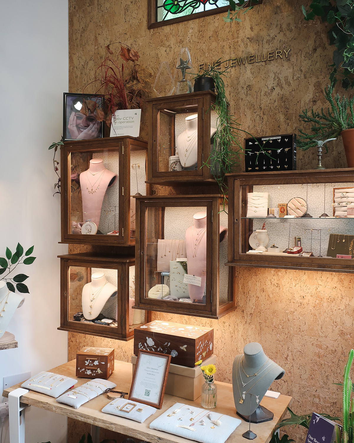 Alex Monroe ロンドンブリッジ店のメインウィンドウ。標本のように額装されたジュエリーが並ぶ。