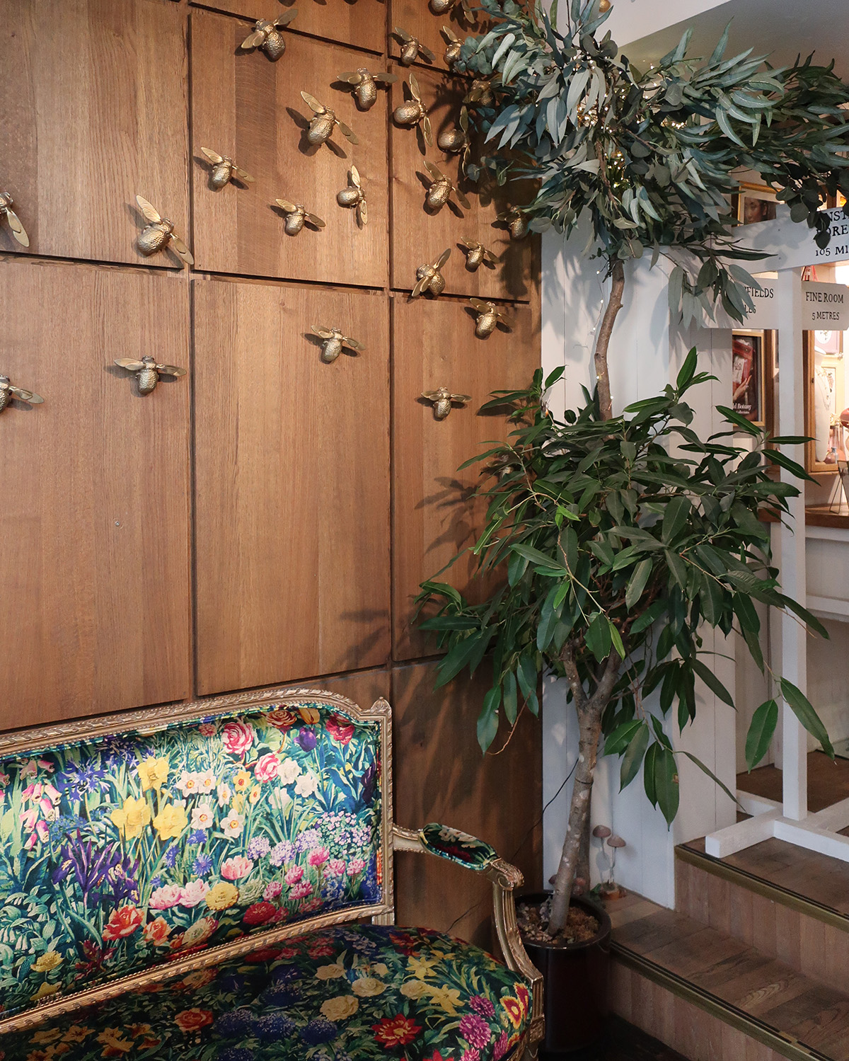 入り口のドアノッカーも、ブランドのアイコンである蜂のモチーフ。