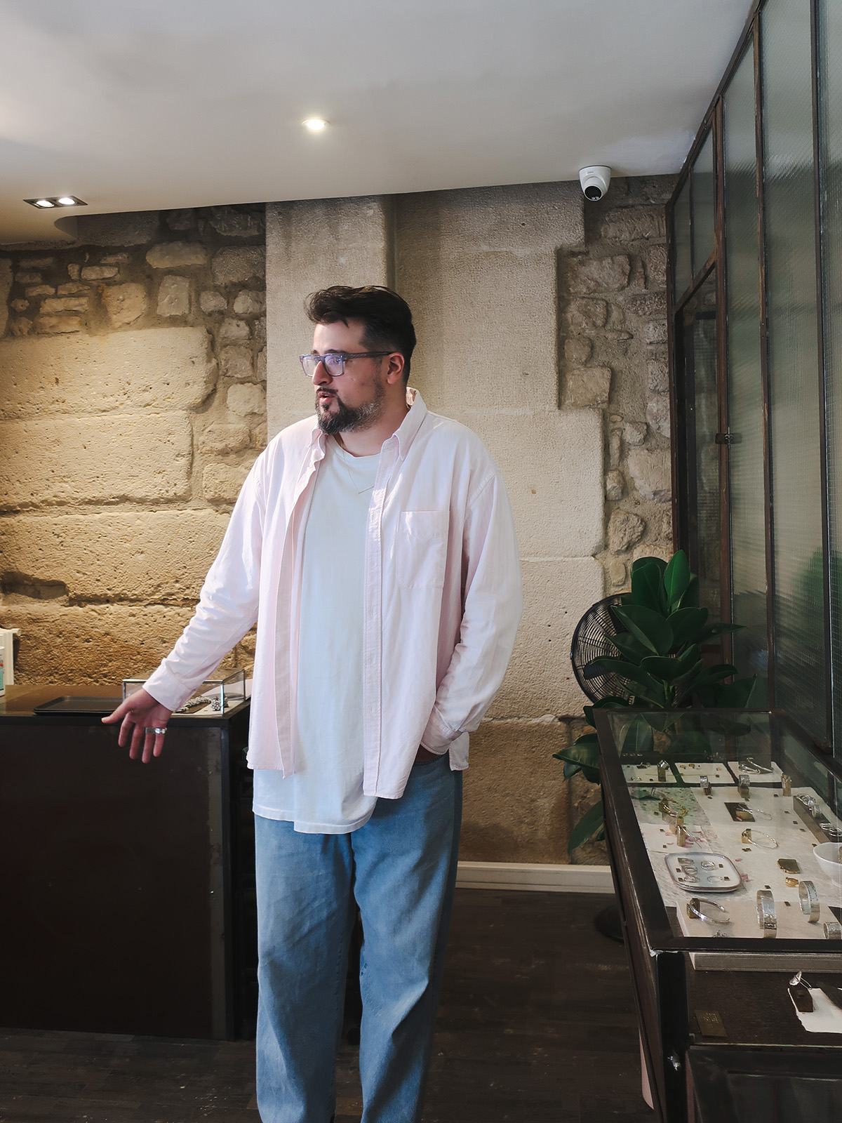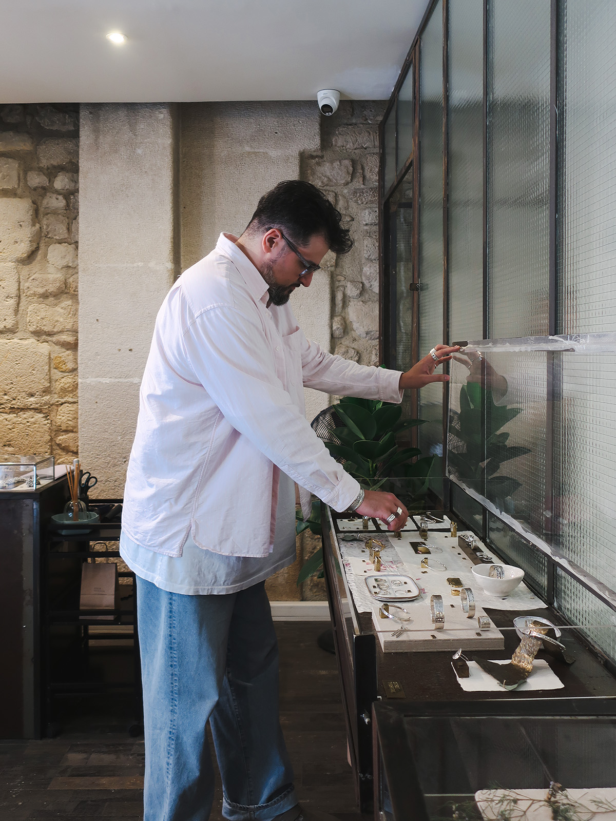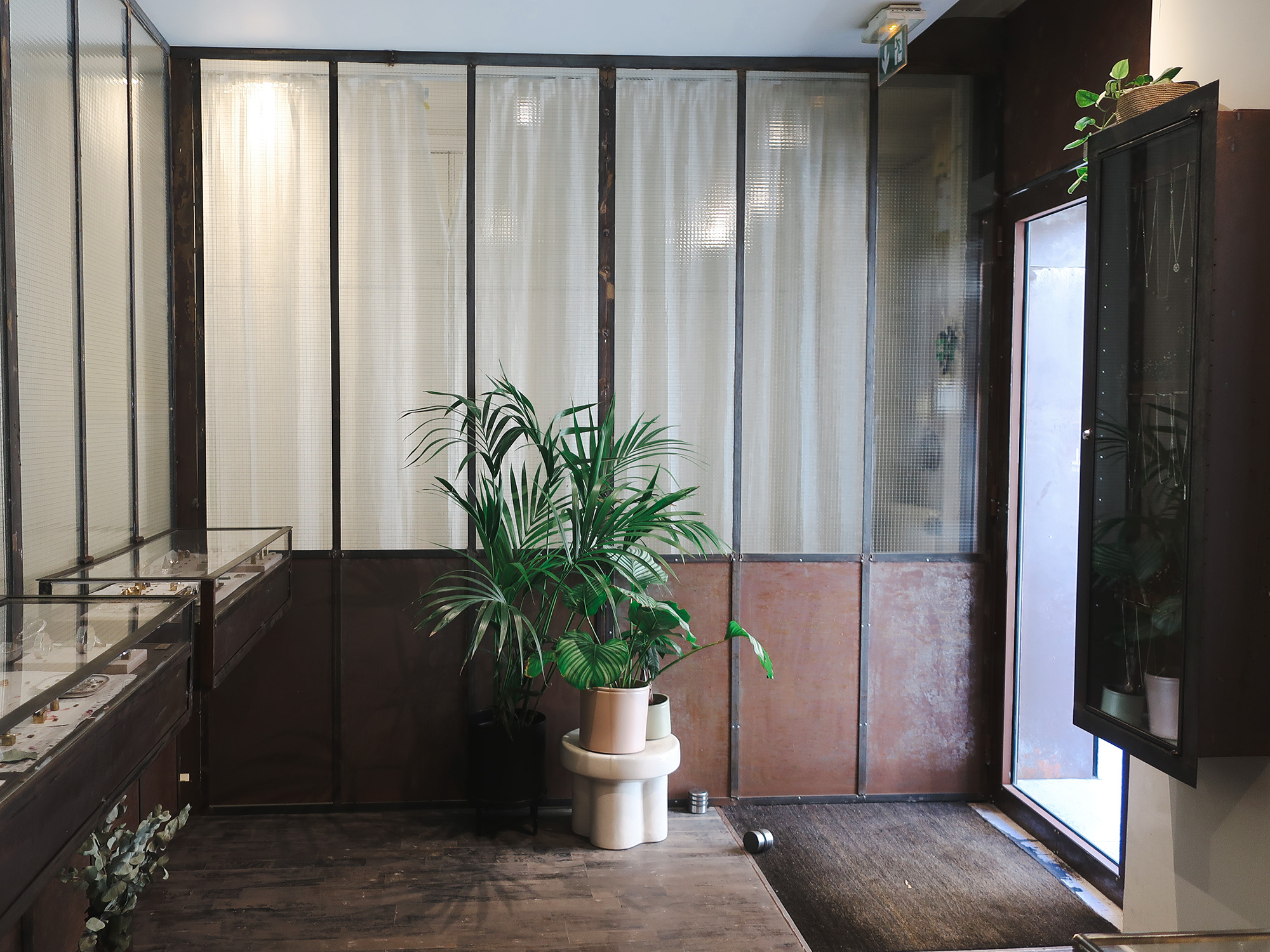 SERGE THORAVALのショップ兼アトリエは、パリ・マレ地区の一角にある。柔らかな自然光が差し込む空間には、メタルとガラスが織りなす静かな緊張感が漂っている。内装の多くは、以前のアトリエから持ち込んだ什器や間仕切りをアップサイクルしたもの。1980年代から使い続けられてきた鋼は、30年以上の歳月を経て自然に酸化し、深みのある表情をまとっている。その佇まいは、意図的につくられた“古さ”ではなく、ブランドが歩んできた時間そのものだ。