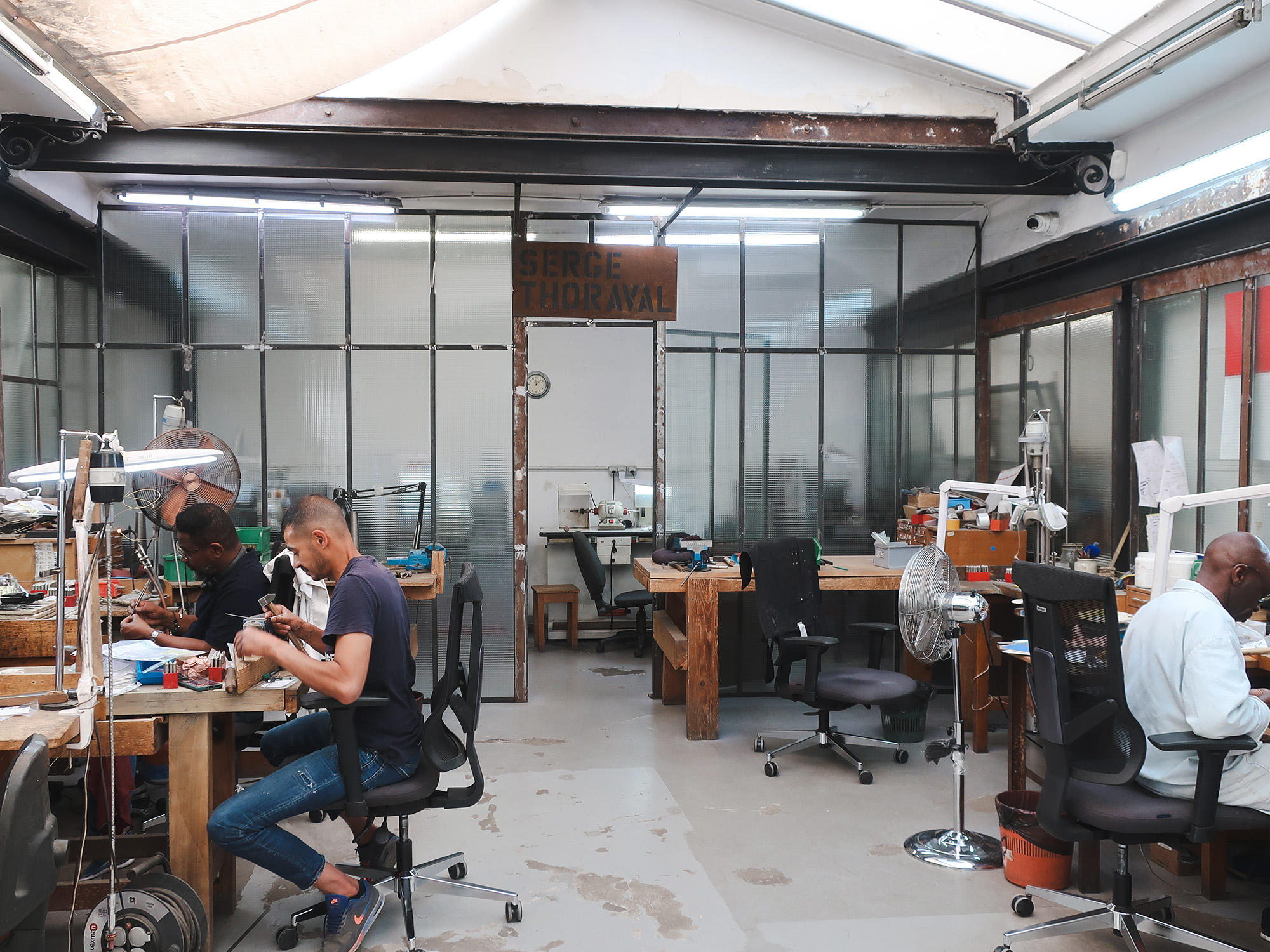 抜け感のあるガラスと重厚なメタルのコントラストが、インダストリアルでありながらどこか温もりのある空気を生み出す。この場所そのものが、SERGE THORAVALの歴史を静かに物語っていた。