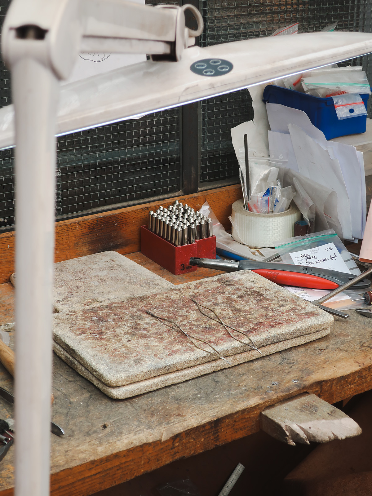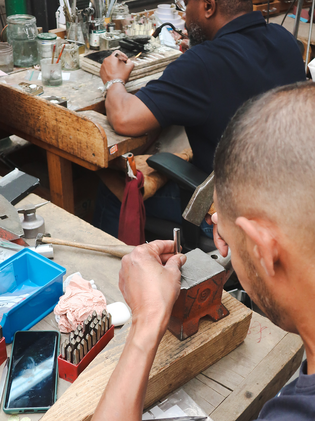 中庭から心地よい風が流れ込むアトリエでは、職人たちが黙々と作業を続けている。金槌を振るう乾いた音、刻印を打ち込む低い衝撃音、研磨機の唸り──それらが重なり合い、作業場全体に無骨なリズムを刻む。