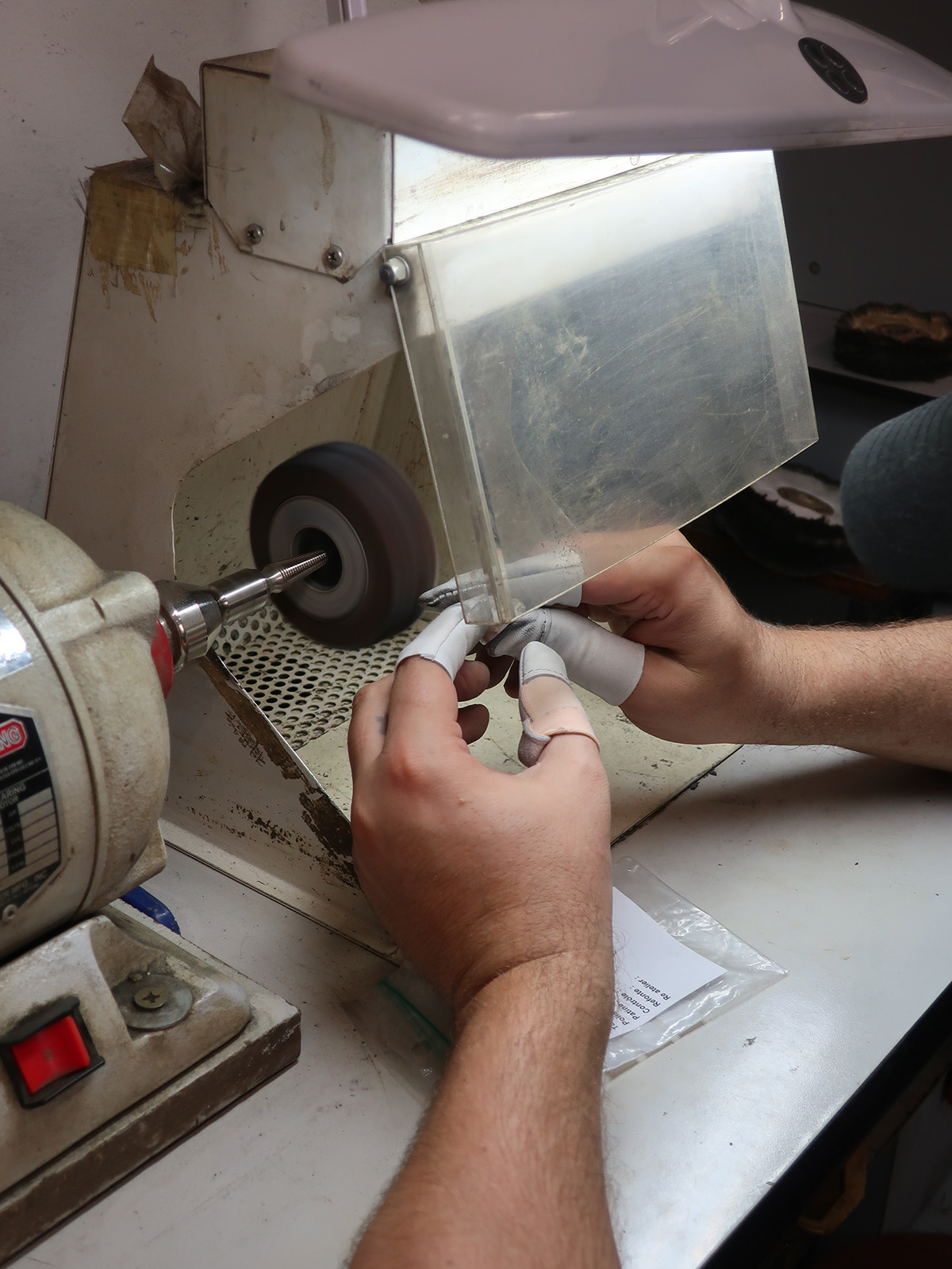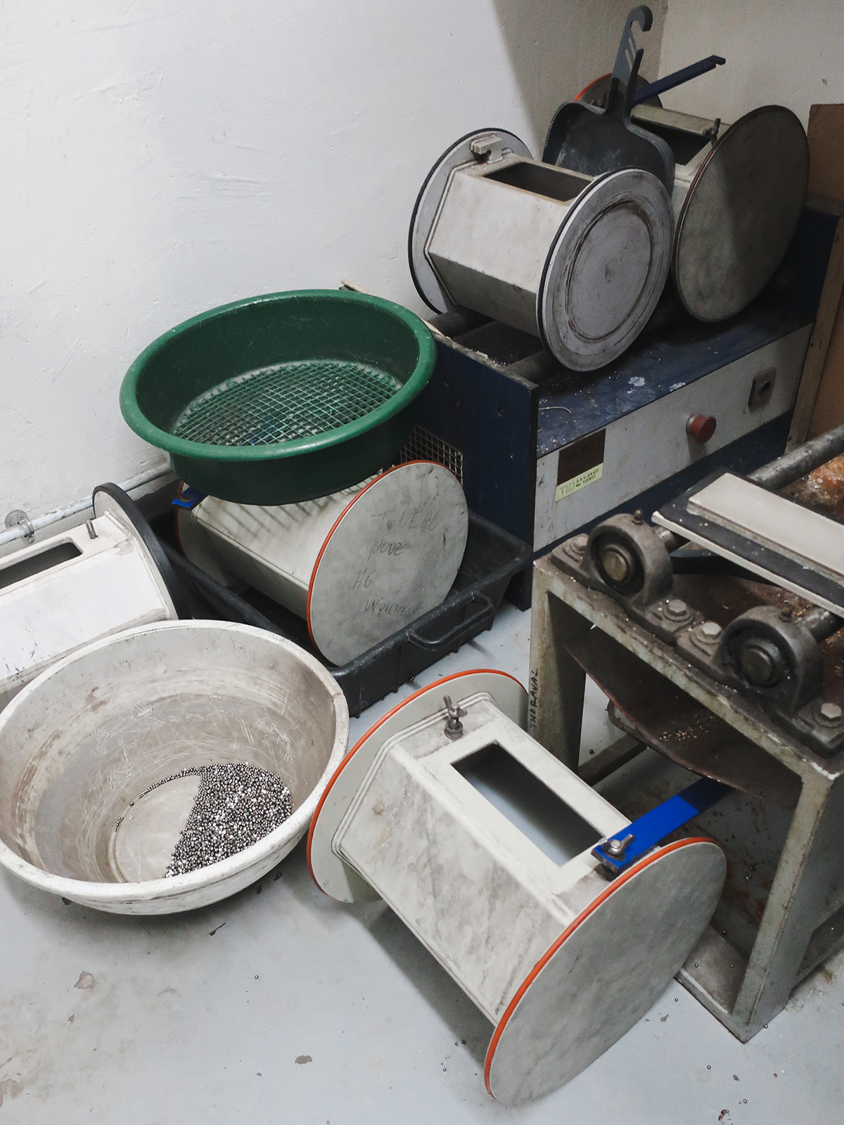 メタルの輝きには欠かせない、研磨作業スペース。セラミックと鋼のビーズも研磨の道具。