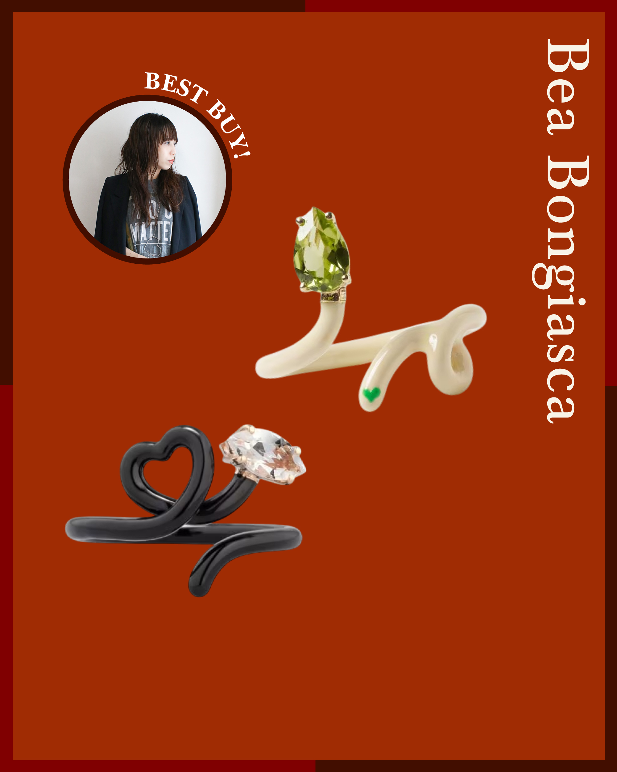 そしてさらにもう1点、Baby Vine Heart Ringはアームで描かれたハートモチーフに、Blackエナメルを合わせることで、甘くなりすぎず程よくシックな印象に。この2本を隣同士の指に着けて、さりげなくハートをリンク…頭の中では妄想コーディネートが既に完成済み。。考える時間まで楽しくなるリングはぜひJewelry Boxに欲しいアイテムですよね。