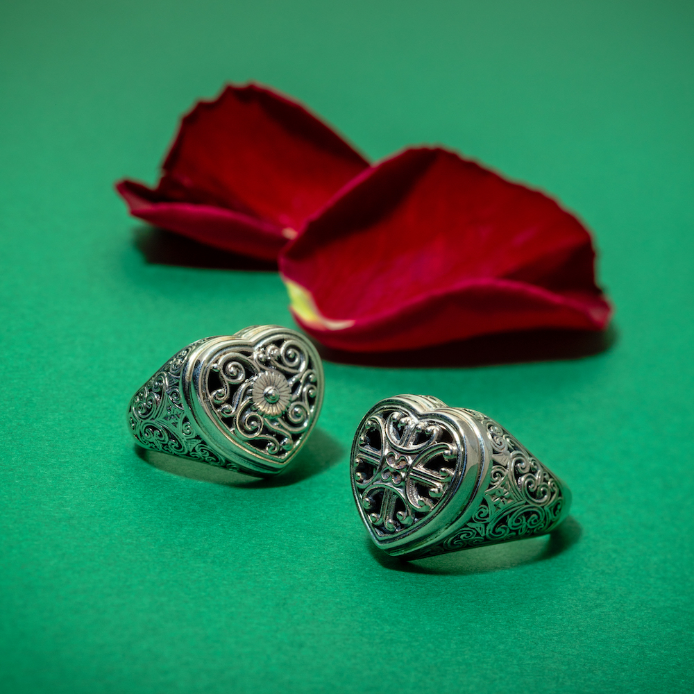 繊細な透かし模様に、ギリシャの装飾美を宿したハートモチーフ。重厚感のあるシルバーが、特別な日の記憶を静かに刻みます。言葉にしきれない想いを託す、記念日のギフトとして。