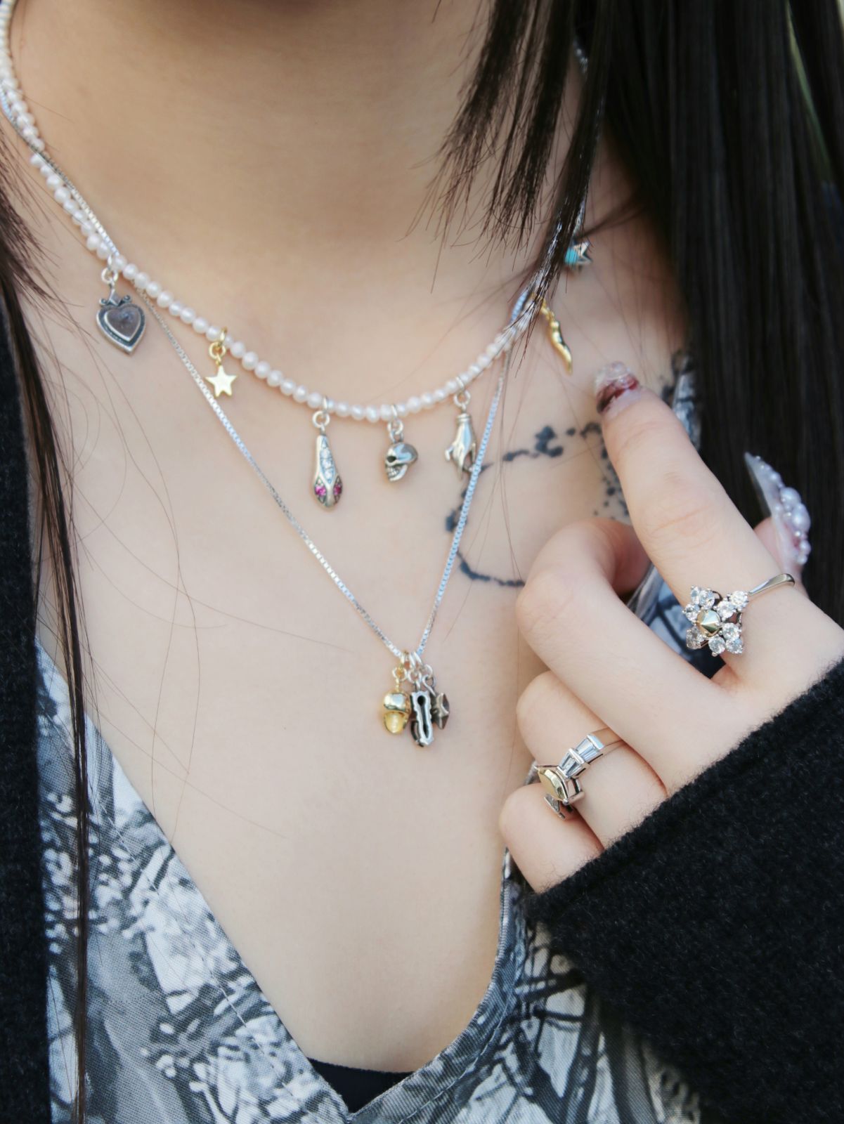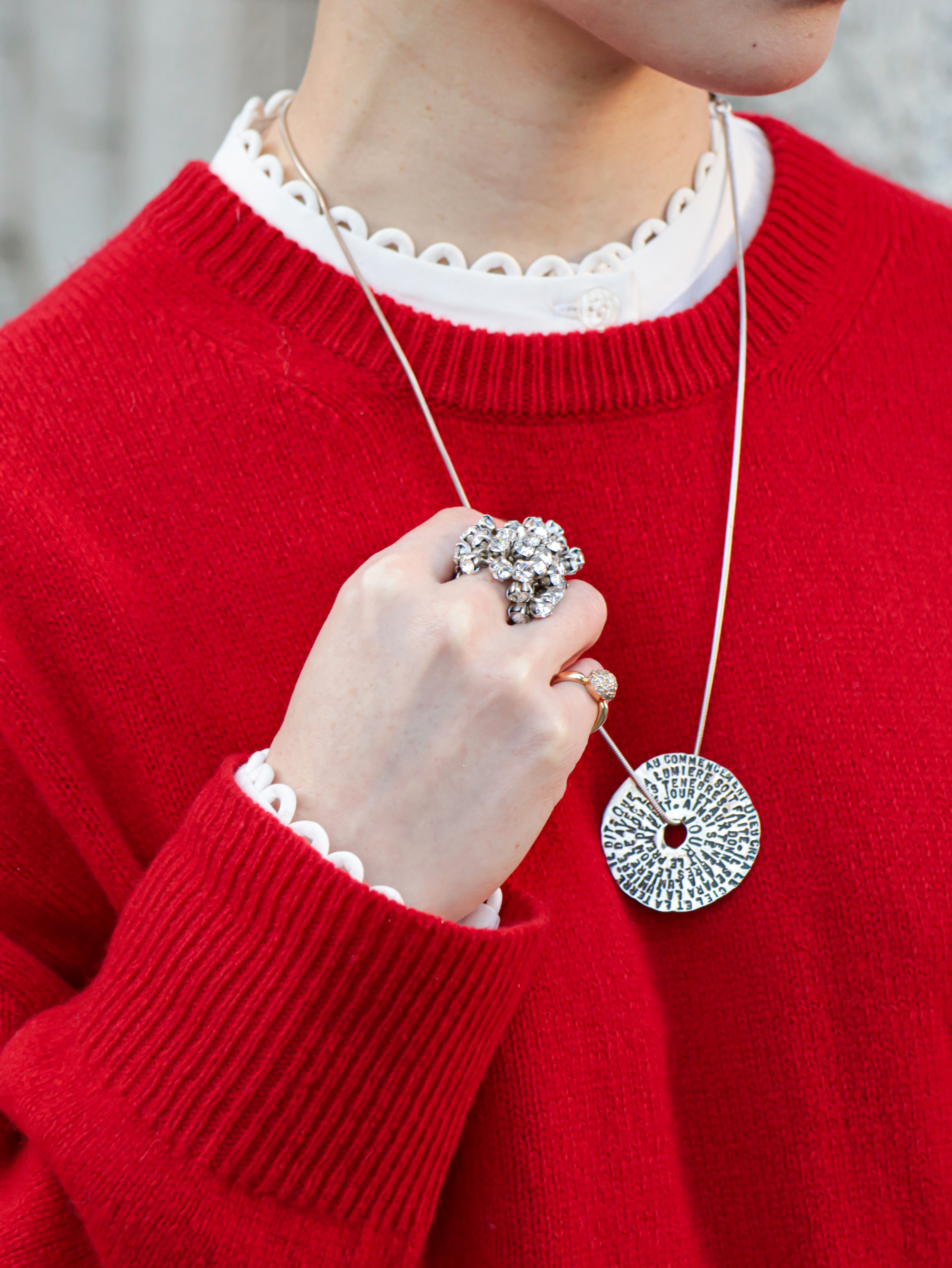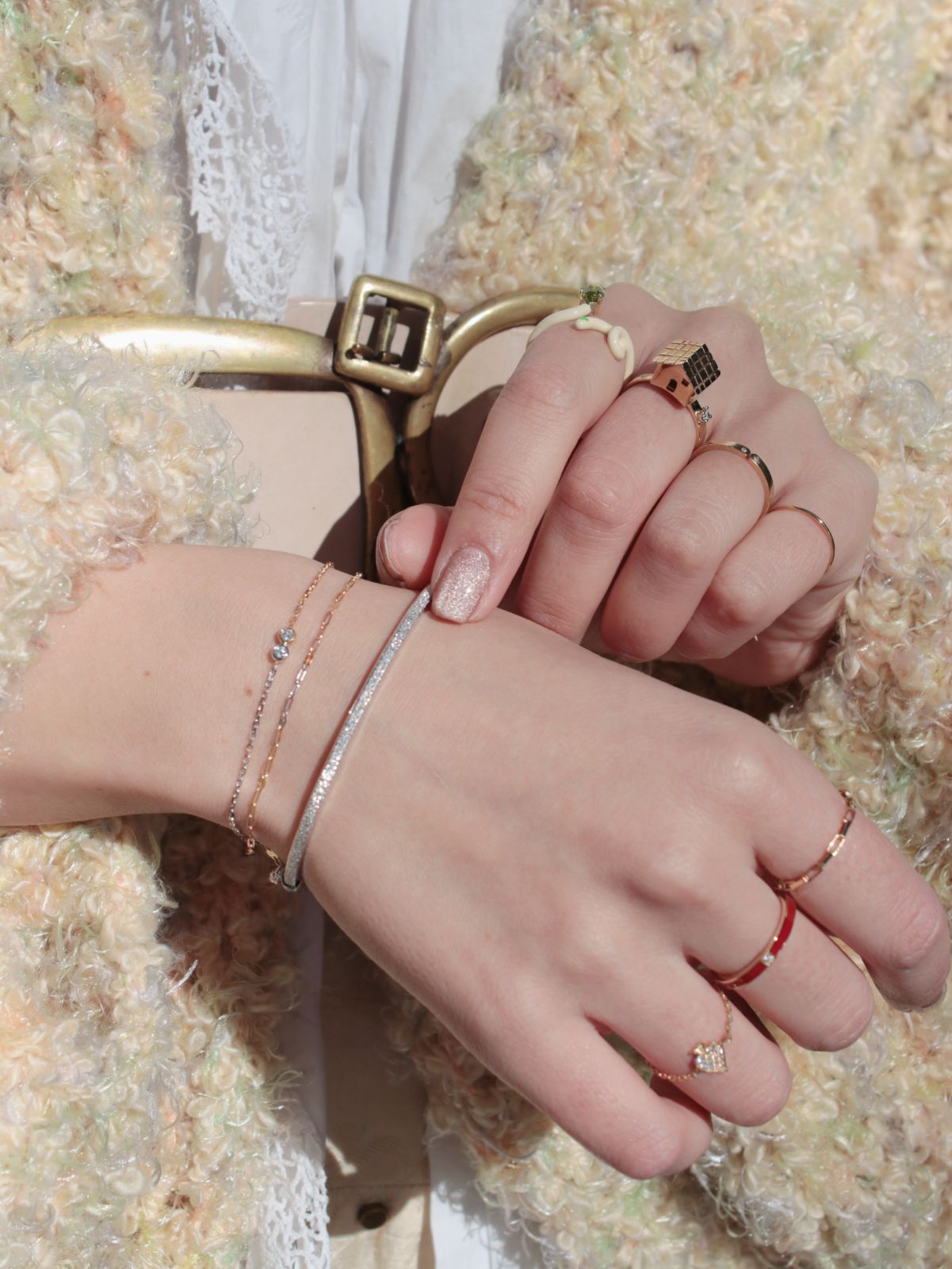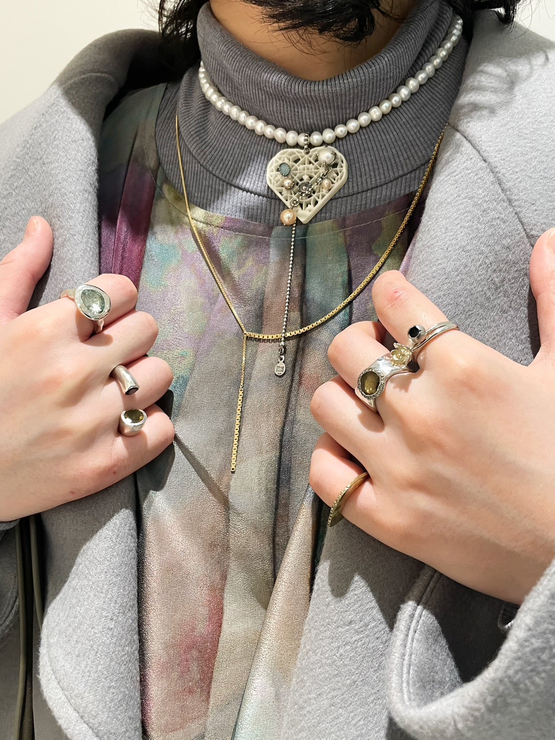 インドアな私ですが、年末年始のわくわく感にのって、なんでもない日でもドレスアップして街へお出かけしたくなっています。寒さに負けず大好きなジュエリーは、いっぱい身に着けたいので、ニットガーデンの首元をあけて、凛と輝くパールと三日月、大人っぽく揺れるY字のチェーンネックレスをレイヤード。手元は、立体的なおうちモチーフや、Bea Bongiasca(ベア・ボンジャスカ)のリングをポイントにどんなアイテムとも相性ばっちりで、完璧なバランスをとってくれるチェーンリングを合わせて◎ウールやベロア素材など、冬らしい、もふもふやわらかいシルエットを楽しみながら、キラーンと輝くジャックルコーのメタリックバッグで引き締めた、お気に入りのコーディネートです♪