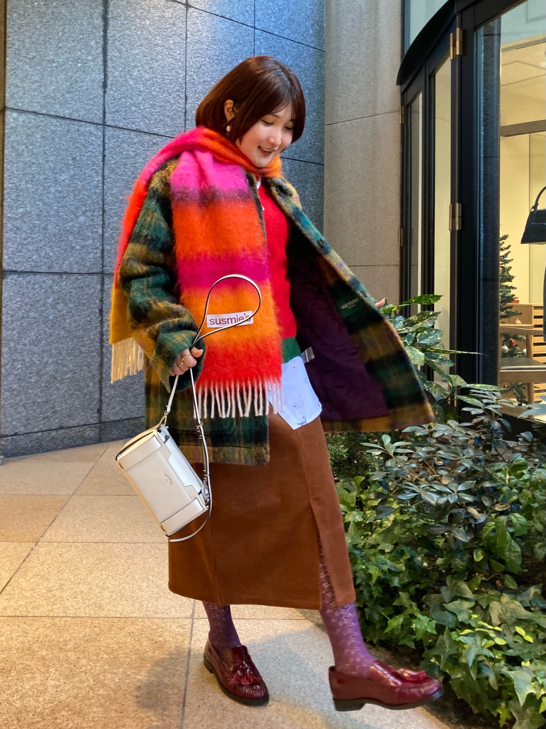 今年のホリデーシーズンは、妹夫婦と一緒にホームパーティーをして過ごす予定です。妹夫婦の料理はとても美味しくてついつい2人分平らげてしまうので、ゆとりのあるシャツともちもちの軽量ニットをチョイスして可愛さを保ちつつゆったりと過ごせるコーディネートにしました!クリスマスらしく、赤ニットにグリーンチェック、トナカイっぽいカラーのコーデュロイスカートをコーディネート。コートの裏地とソックスの色を統一しているところもぬかりなく可愛い密かなポイントです♡Susmies Collection(ススミーズコレクション)のマフラーは敢えて明るい暖色系にして、主役級に目立つ色合いに。クリスマスプレゼントにも購入した、リアルバイアイテムです。お出かけしないと勿体ないくらい可愛い仕上がりになったので、神戸の布引ハーブ園で開催中のナイトクリスマスマーケットにも足を運びたいです♪