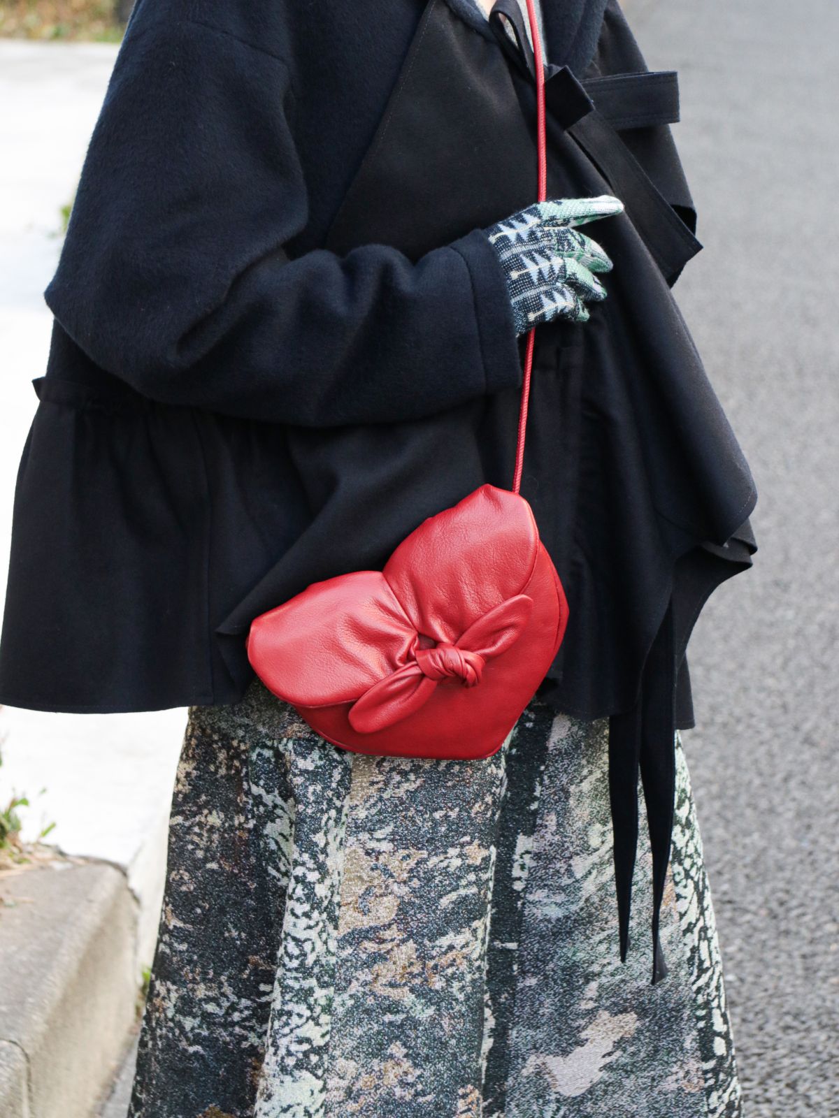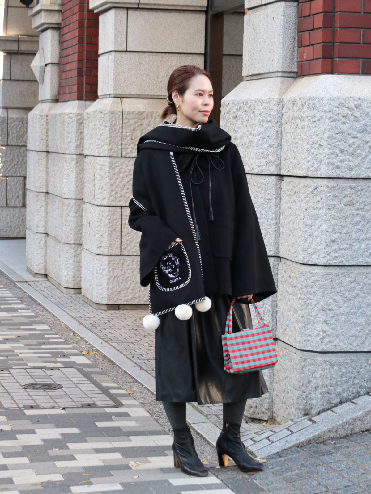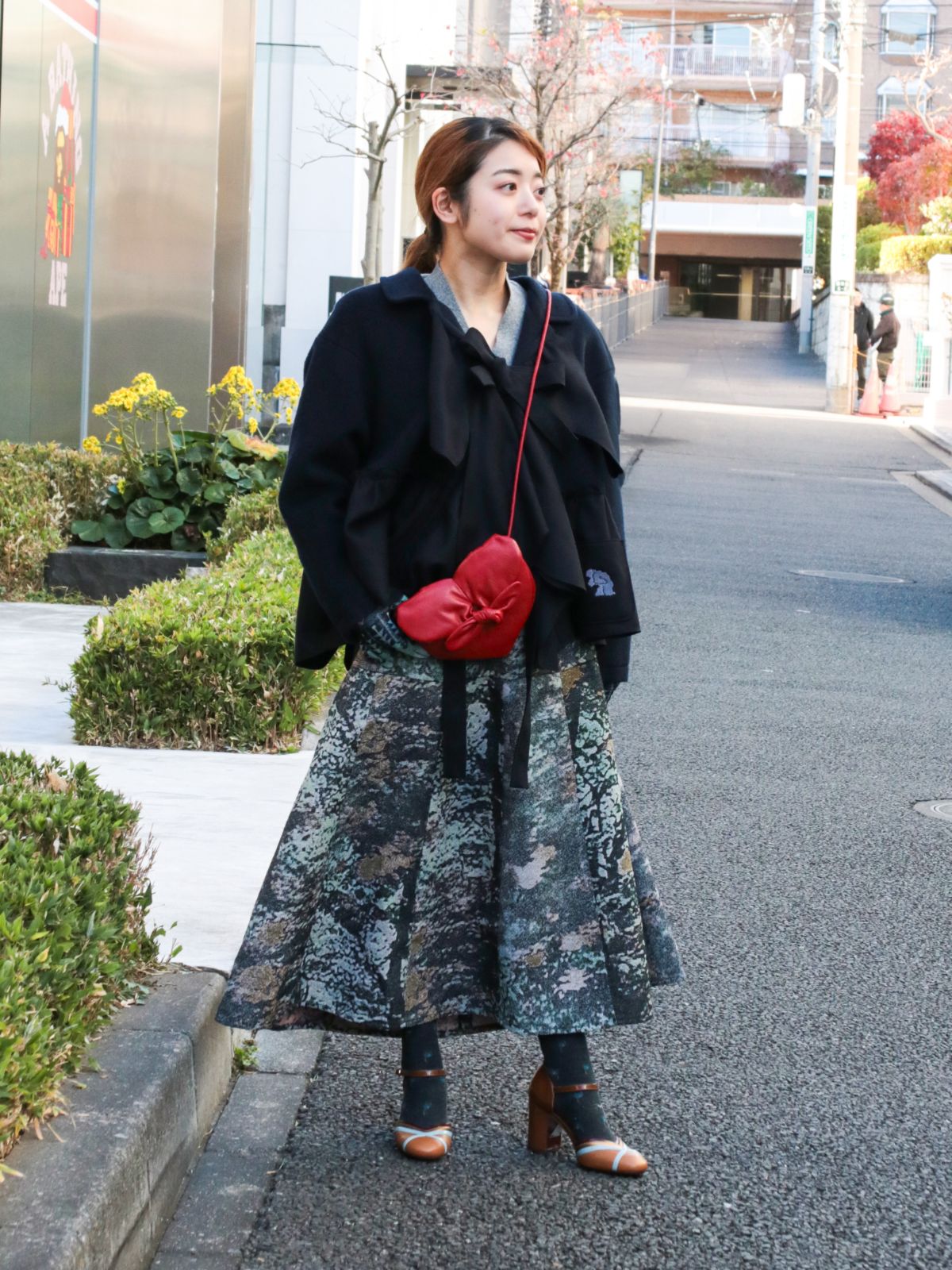 冬の街にそっと溶け込むような、大人の華やかさを感じるドレスアップスタイル。柔らかな黒のアウターに、アートのような色彩が広がるロングスカートを合わせて、品よく奥行きのあるレイヤードに。CHIE MIHARA(チエミハラ)MERMANのブラウン×メタリックのストラップシューズでリズムを添え、遊び心のあるタイツが冬のおしゃれをいっそう楽しくしてくれます。ポイントは、コーデ全体を温かく彩る真っ赤なHEREU(ヘリュー)のハートバッグ。落ち着いたトーンの装いにひとさじの可愛さと特別感を加え、ホリデーらしいムードをほどよく演出してくれます。年末年始は、久しぶりに家族とゆっくり過ごす予定。街を歩いたり、のんびり外へお出かけしたりしながら、穏やかな時間を楽しみたいと思います。