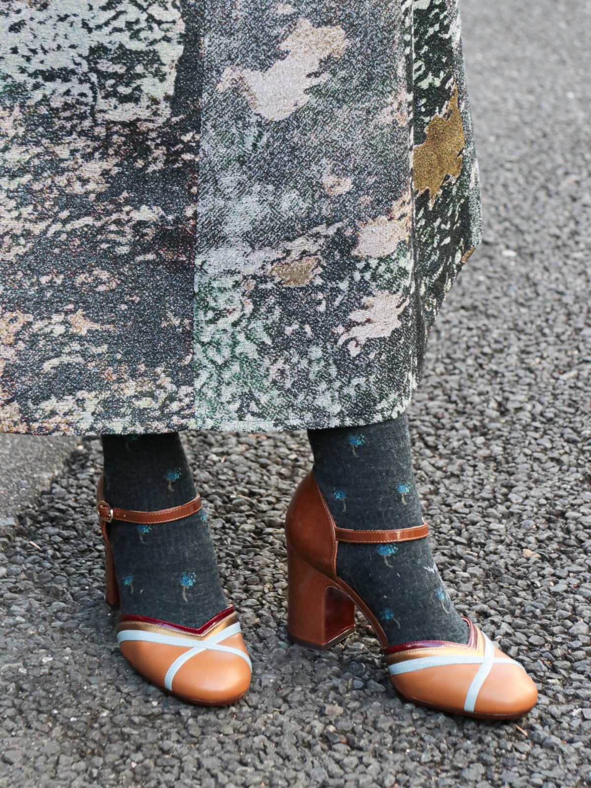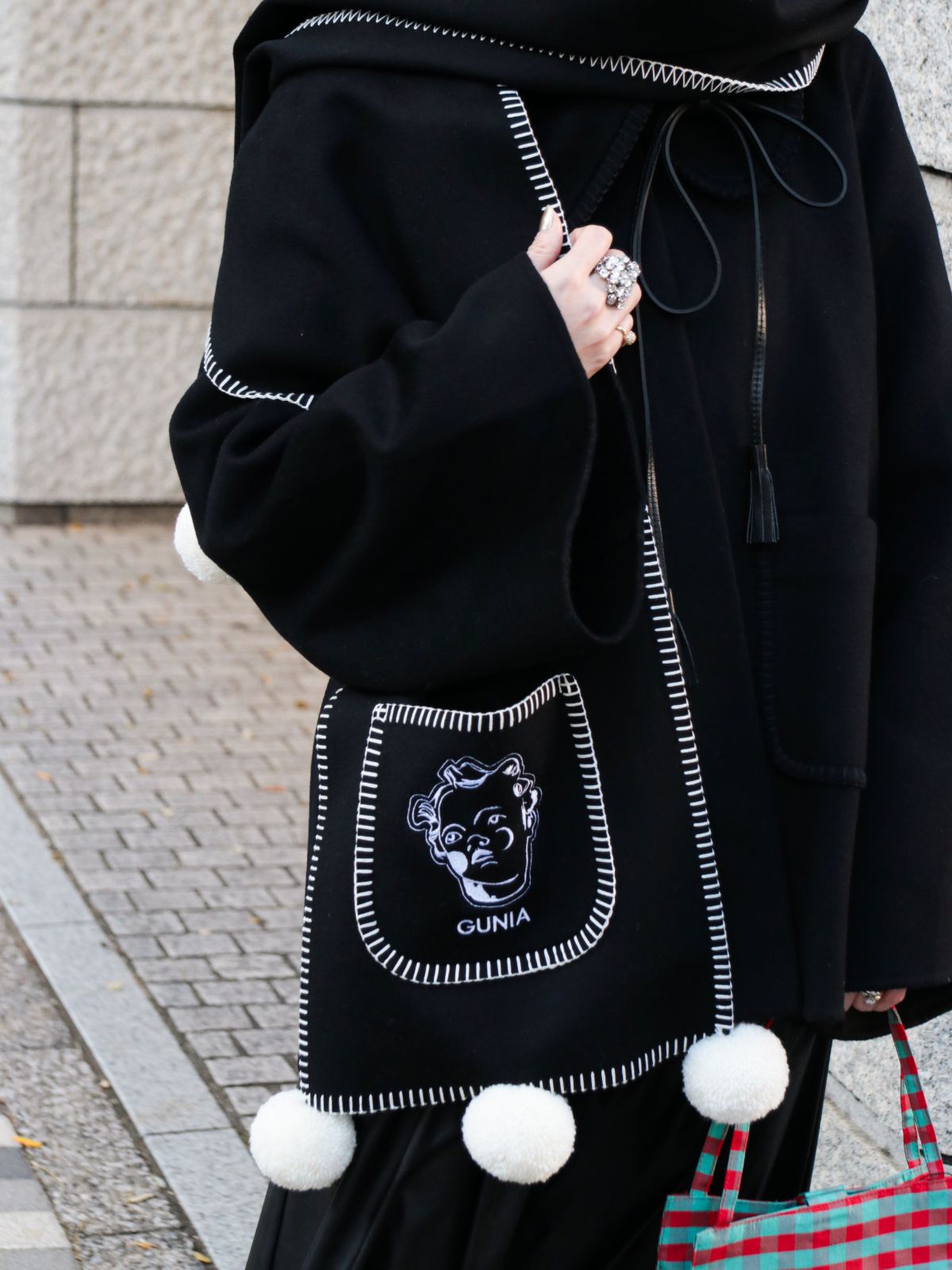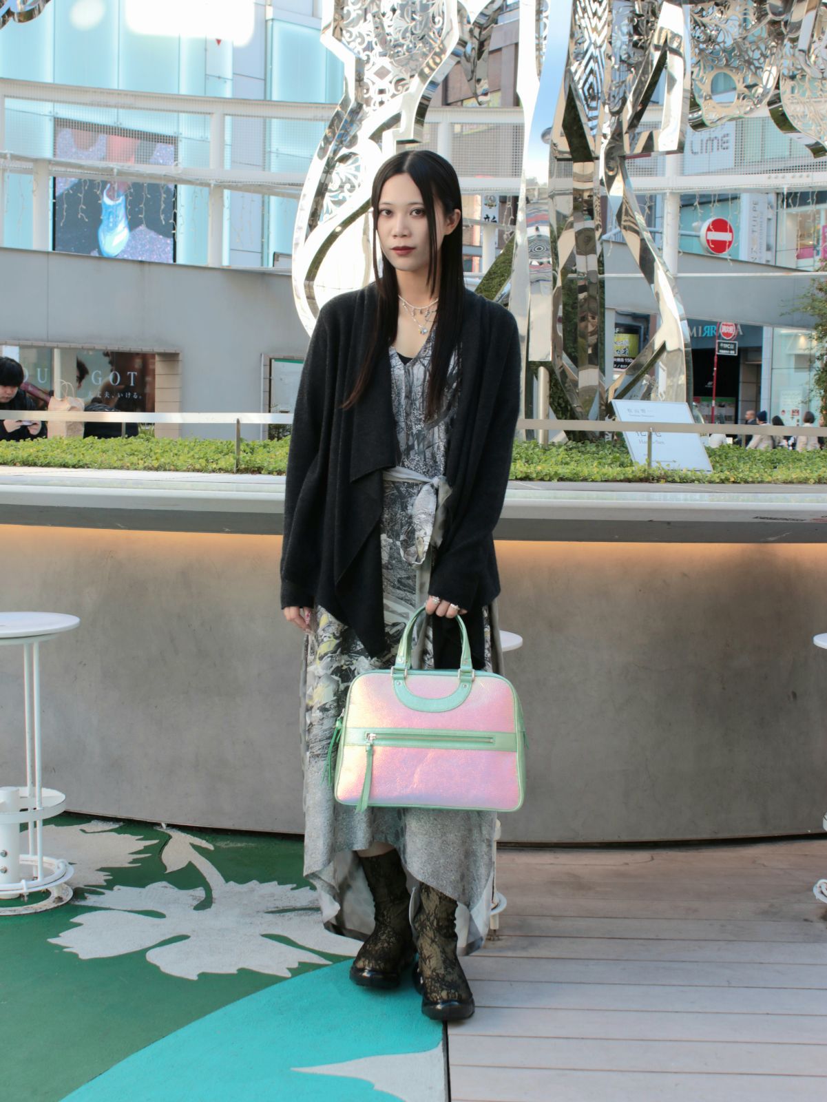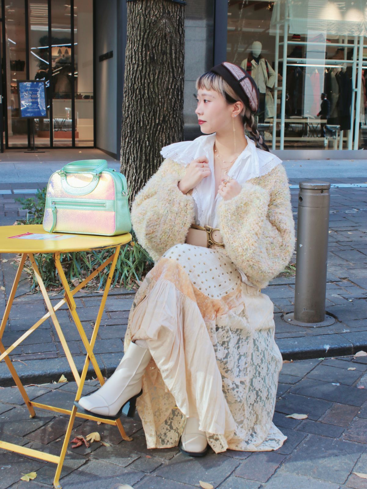 冬の街にそっと溶け込むような、大人の華やかさを感じるドレスアップスタイル。柔らかな黒のアウターに、アートのような色彩が広がるロングスカートを合わせて、品よく奥行きのあるレイヤードに。CHIE MIHARA(チエミハラ)MERMANのブラウン×メタリックのストラップシューズでリズムを添え、遊び心のあるタイツが冬のおしゃれをいっそう楽しくしてくれます。ポイントは、コーデ全体を温かく彩る真っ赤なHEREU(ヘリュー)のハートバッグ。落ち着いたトーンの装いにひとさじの可愛さと特別感を加え、ホリデーらしいムードをほどよく演出してくれます。年末年始は、久しぶりに家族とゆっくり過ごす予定。街を歩いたり、のんびり外へお出かけしたりしながら、穏やかな時間を楽しみたいと思います。
