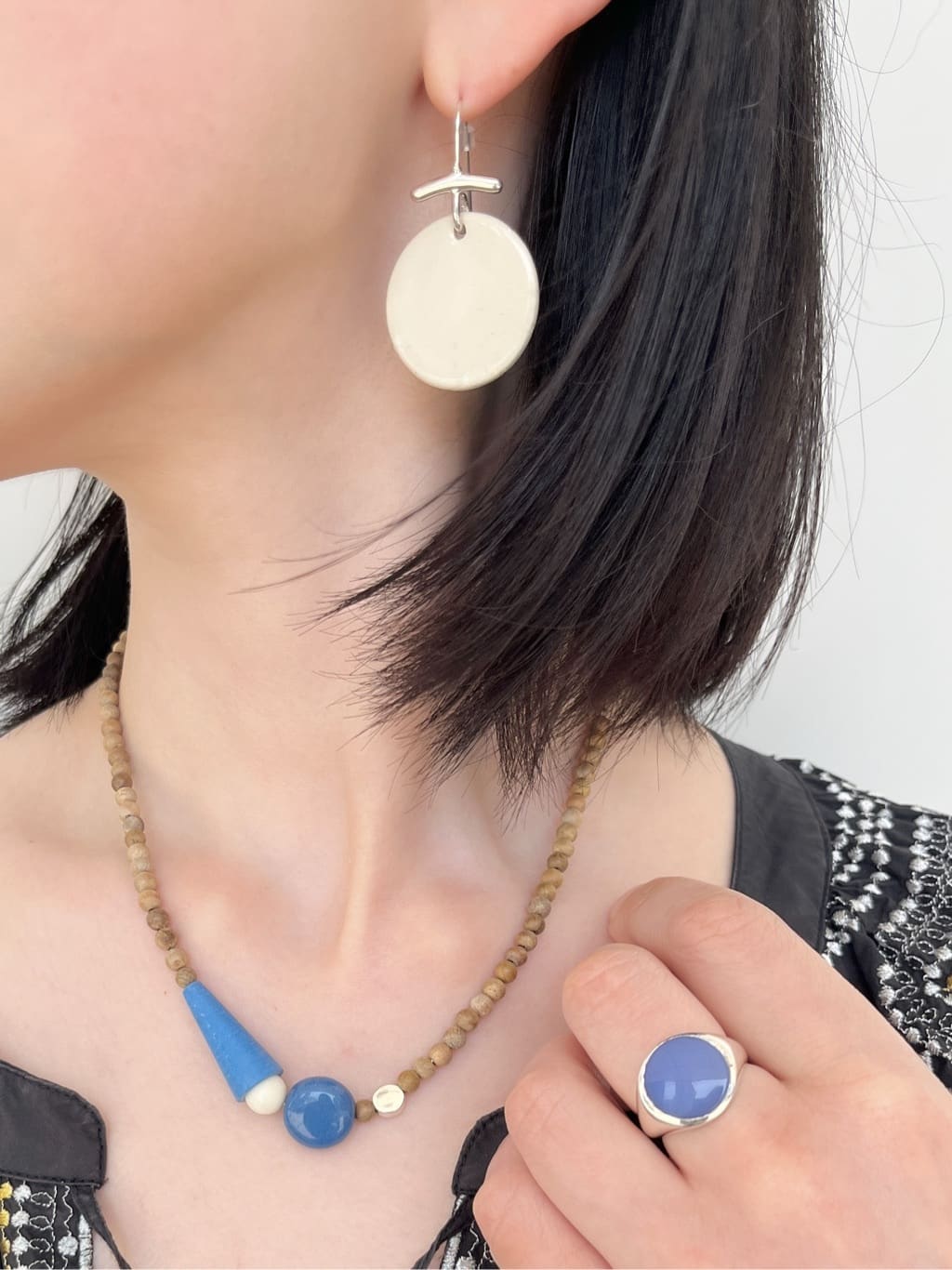 H.P.FRANCE BIJOUX 新宿店のスタッフが選ぶおススメのセールアイテムは、Helena Rohner(ヘレナ・ローナー)のジュエリー。ブルーのアイテムを中心にコーディネート。ブルー、シルバーとホワイトでクリアな印象を意識しつつ、ネックレスのウッドパーツがアクセントに。