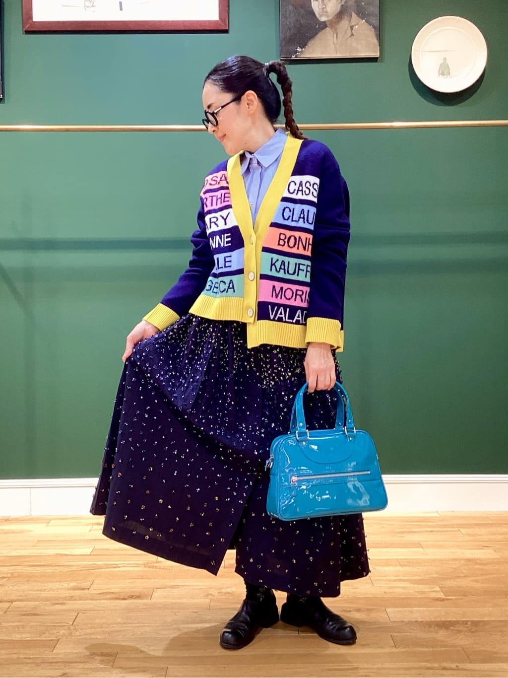 H.P.FRANCE 福岡店のスタッフが選ぶおススメのセールアイテムは、mii collection(ミーコレクション)のカーディガン。鮮やかな配色とユニークな文字デザインが目を惹きます。アートの世界で活躍した女性たちの名前が並び、創造性と個性を讃える遊び心ある一枚。ネイビーをベースに、袖口や裾、Vネックラインのイエローがアクセント。カラーブロッキングの美しさと柔らかなシルエットが、日常の装いをアートのように彩ります。