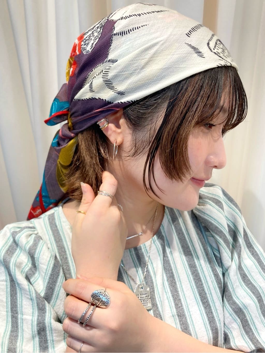 Déclic 大阪店のスタッフが選ぶおススメのセールアイテムは、INOUI EDITIONS(イヌイ・エディション)のストールをヘッドスカーフとして使用。こちらを見つめてくるパグに胸を射止められました。落ち着いた色味で、ベースカラーはスモーキーなパープルなので秋冬ファッションに持ってこいです!