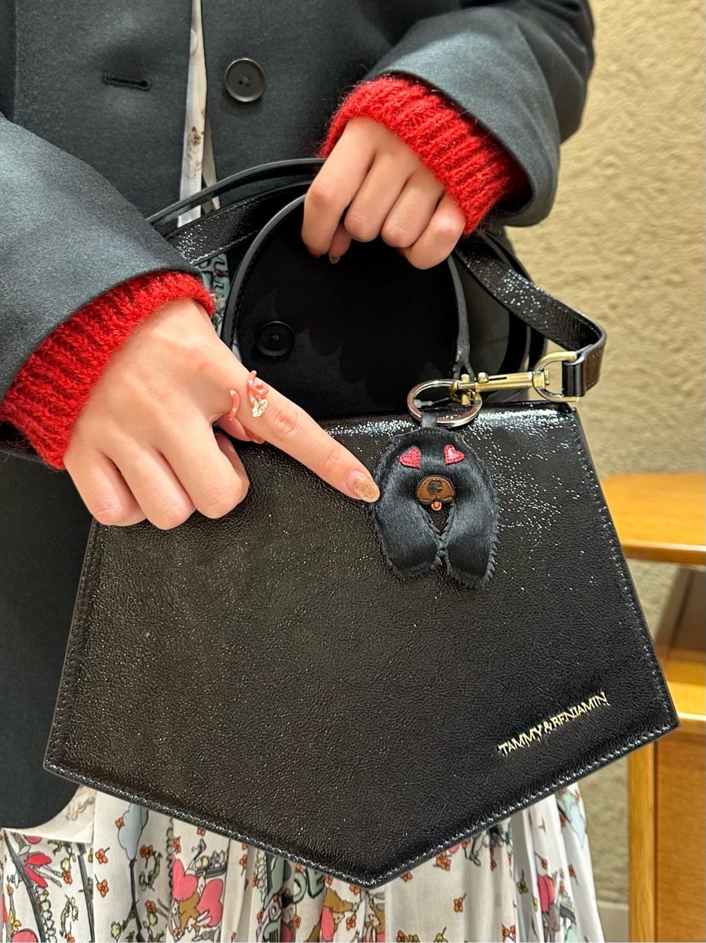 Déclic 大阪店のスタッフが選ぶおススメのセールアイテムは、TAMMY & BENJAMIN(タミーアンドベンジャミン)のレザーバッグ。五角形のシルエットがコーディネートに凛とした現代的なエレガンスを演出してくれます。ショルダーバッグとしても使える2WAYタイプで汎用性も抜群です。AGNELLE アニェル)のキーリングをプラスしてアクセントに。目がハートのワンちゃんがキュート!