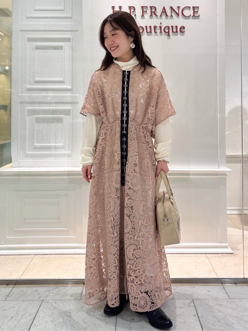 H.P.FRANCE Boutique 広島店のスタッフが選ぶおススメのセールアイテムは、support surface(サポートサーフェス)のワンピース。前開きの華やかなそうレースのワンピースはくすみすぎていないミュートピンクに連なったホックがアクセントに。ジュエリーや小物はツヤのあるものを合わせてやわらかな印象に仕上げました。