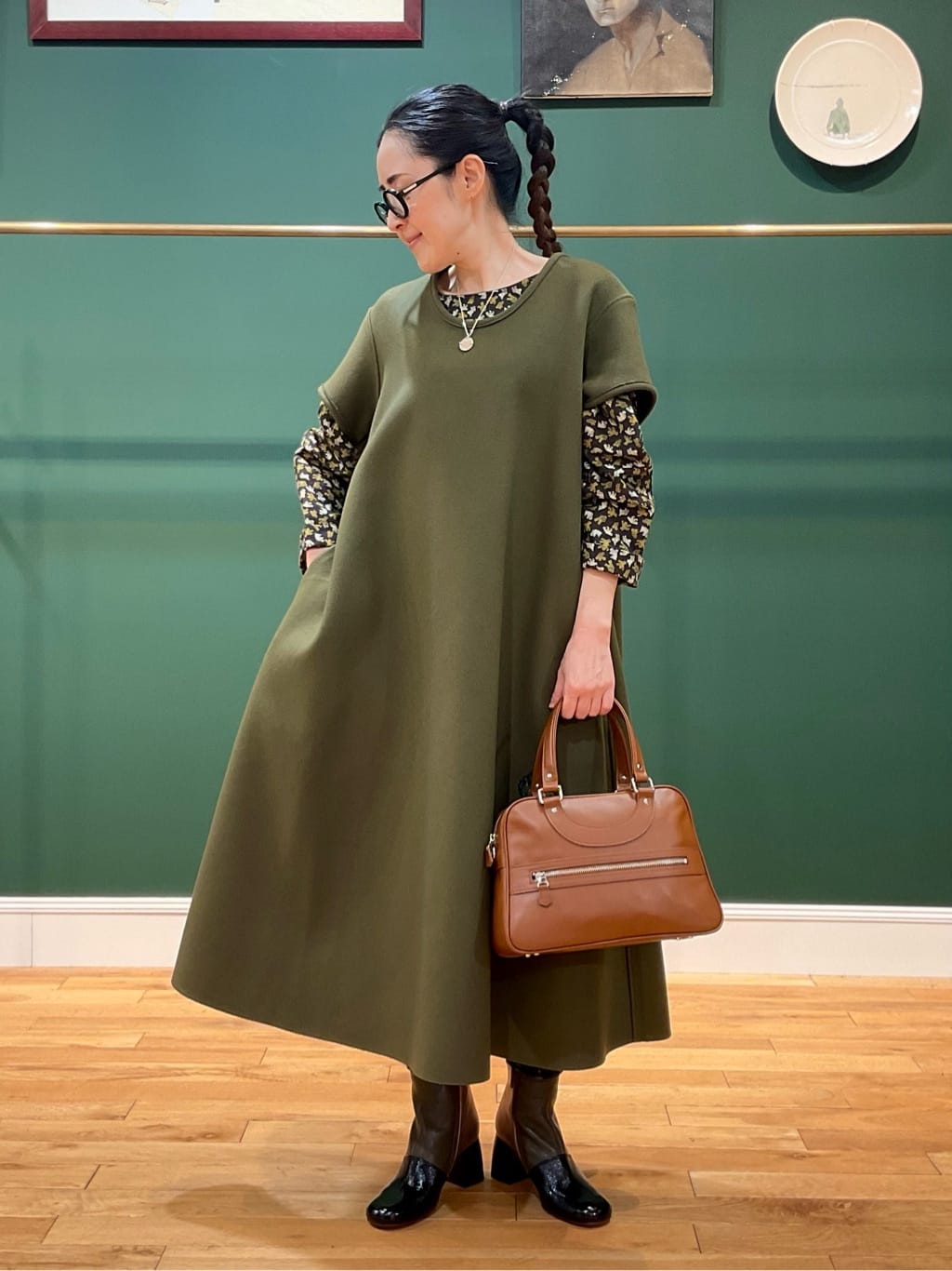 H.P.FRANCE 福岡店のスタッフが選ぶおススメのセールアイテムは、D-due(デ・ドゥエ)のワンピース。テーマのMOSSYに合わせたカーキを基調としたシリーズ。スッキリとしたシルエットで、リラックスした中にも上品な印象を演出。MOSSYがプリントされたブラウスを重ねて、コーディネートのアクセントとしてエレガントな表情を添えました。