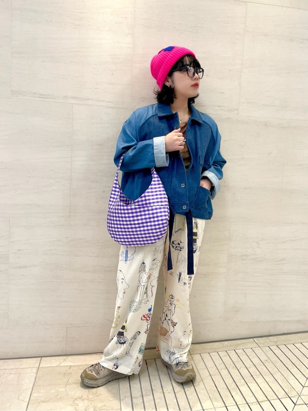 mii collection(ミーコレクション)のパンツ。上質なシルクに合体画が手作業でプリントされた軽い着心地のパンツは、シーズン問わず着用できるアイテム。帽子やバッグもチャーミングな小物を合わせて賑やかで楽しげなコーディネートが完成。