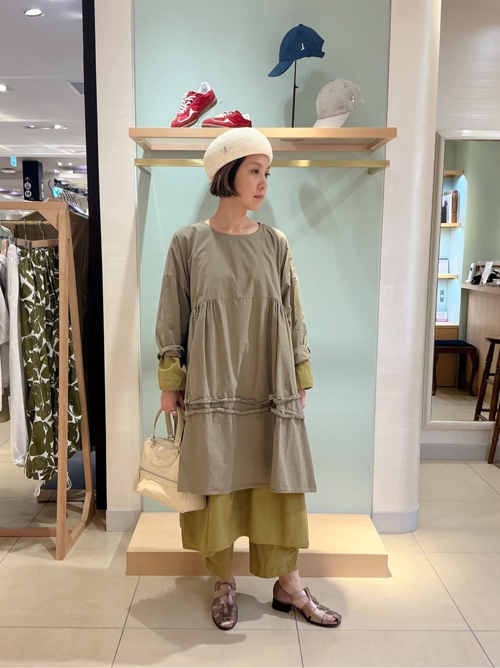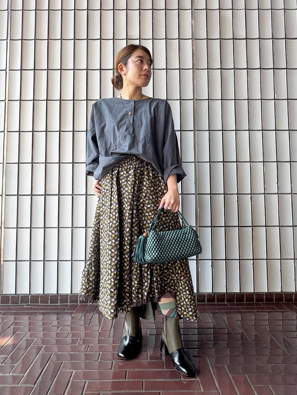 ブランドのアイコン的なロングランのブラウスで、ギャザーを入れて段々に切り替えたふわりと広がるシルエットが特徴。ゆったりとした身幅にやや細めの袖が着用するとすっきりとした印象です。同素材のパンツとのセットアップや、ノースリーブワンピースとのアンサンブルでの着用がおススメです。