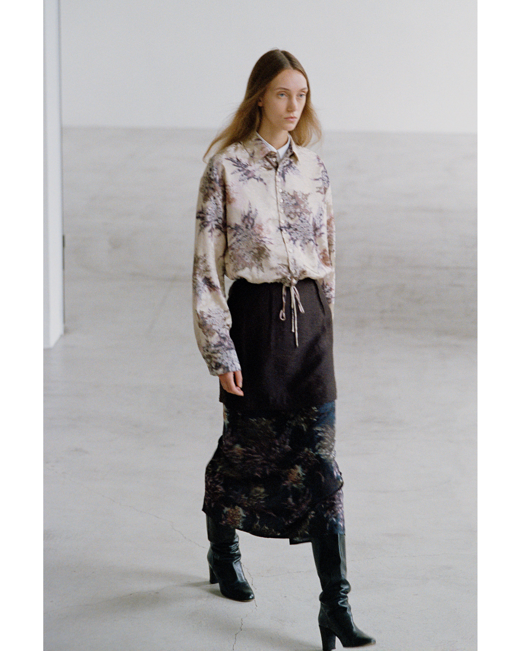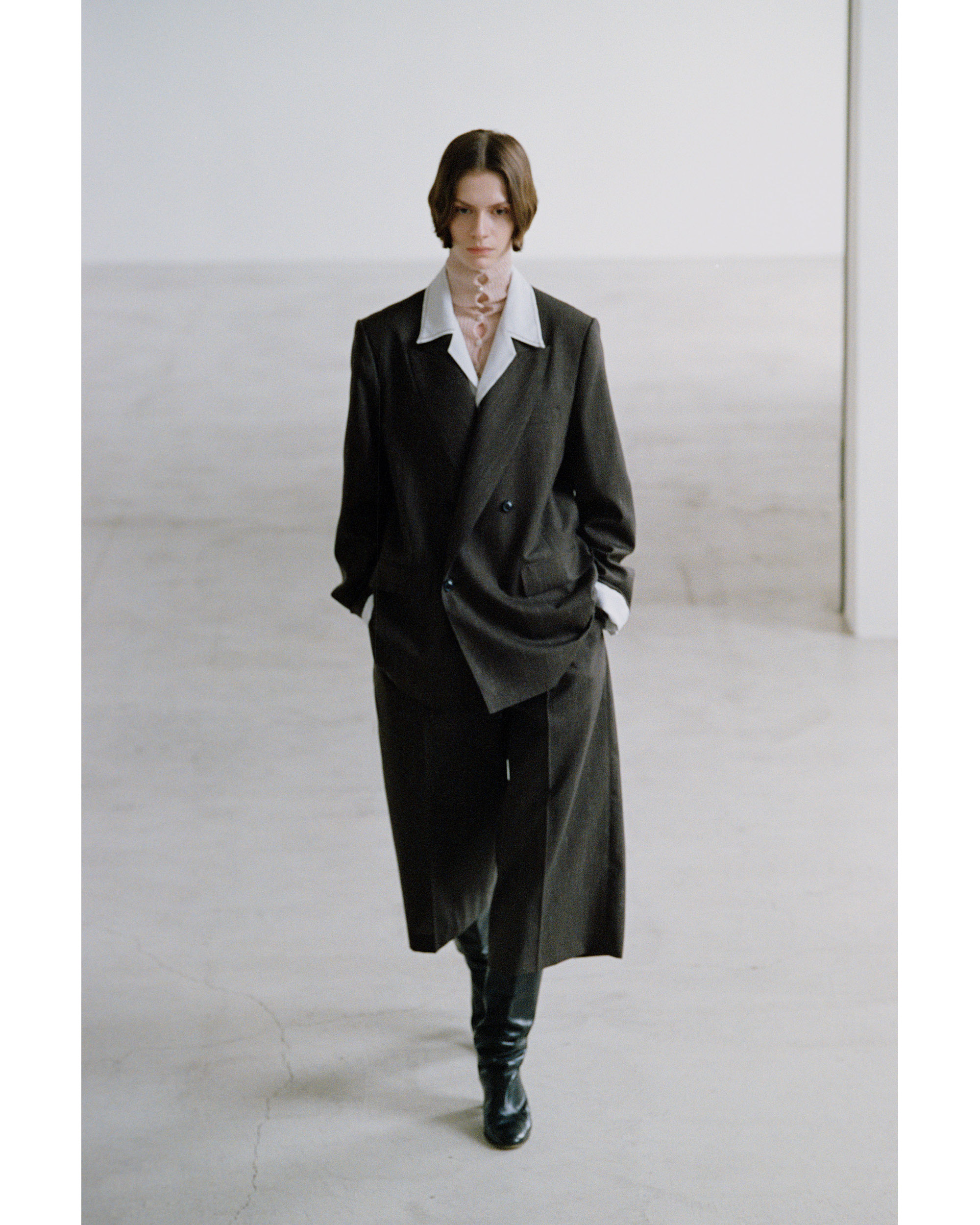 街の喧騒からふと離れ、心がニュートラルへと還る瞬間。今季は、洗練と自然、均整と不均整のあわいを行き来しながら、静かな緊張と緩やかさを内包する佇まいを描きます。リネンキュプラを走らせたサマーウールや極薄のウールトロピカル、繊細なレザーや白顔料加工のデニム。異なる質感が重なり合い、静けさの中に確かな存在感を宿すコレクションです。