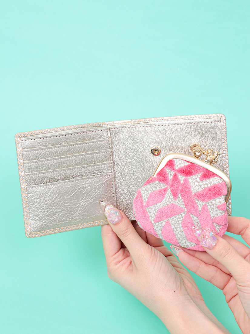 二つ折りのお札入れの内側に、取り外し可能ながま口を備えた、人気の折財布。