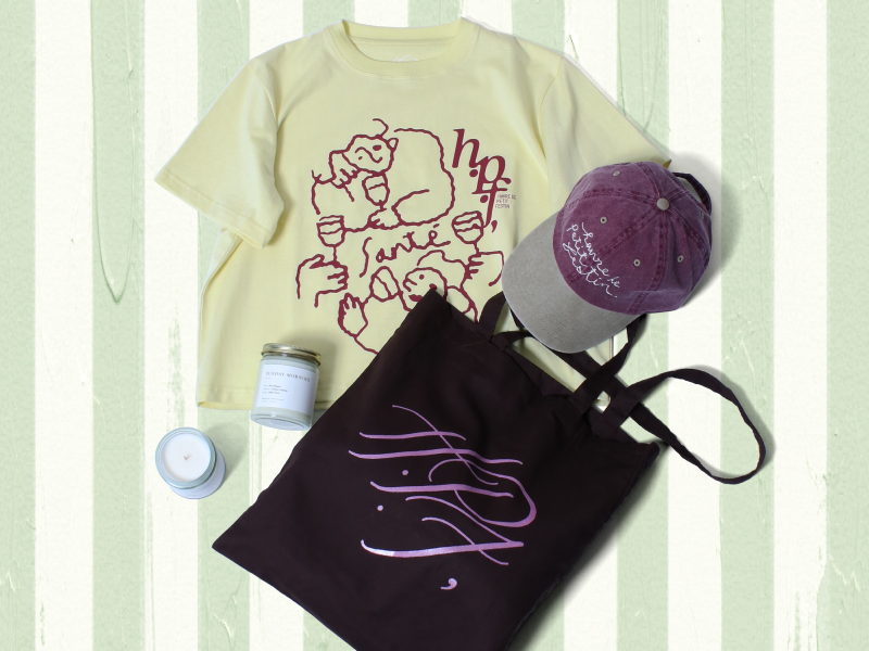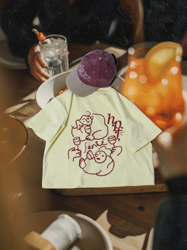 例えば、パリの路地裏にあるキオスクで売られているようなキャップ、あるいは北欧の静かな美術館のミュージアムショップで見つけたTシャツなど。"H.P.F,"に省力されるショップロゴを基調にしたデザインは、機能的な日常着でありながら、どこか遠くの異国を想起させる「インスピレーションの源」となります。