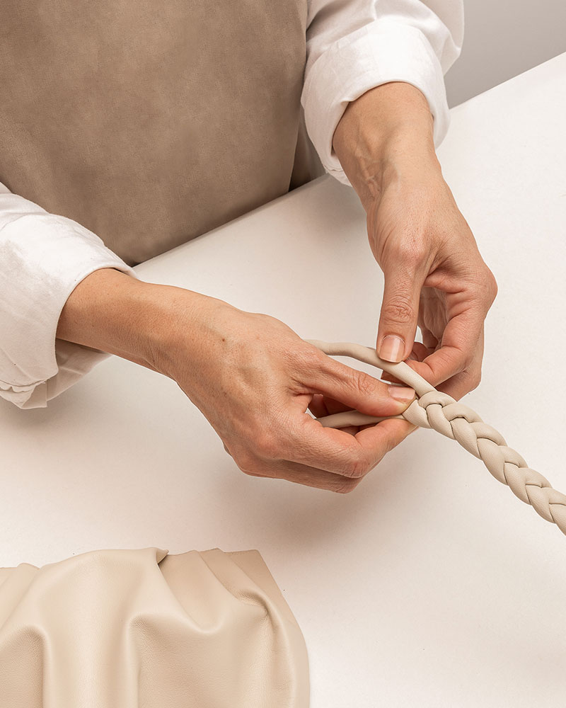 また、スペイン産の高品質な革は、HEREUのバッグにとって欠かせない素材です。アリカンテ地方の工房では複数の紐を撚りながら強度を生み出す独自の編み技法も取り入れられ、ブランドならではのクラフト感と洗練された印象を生み出しています。