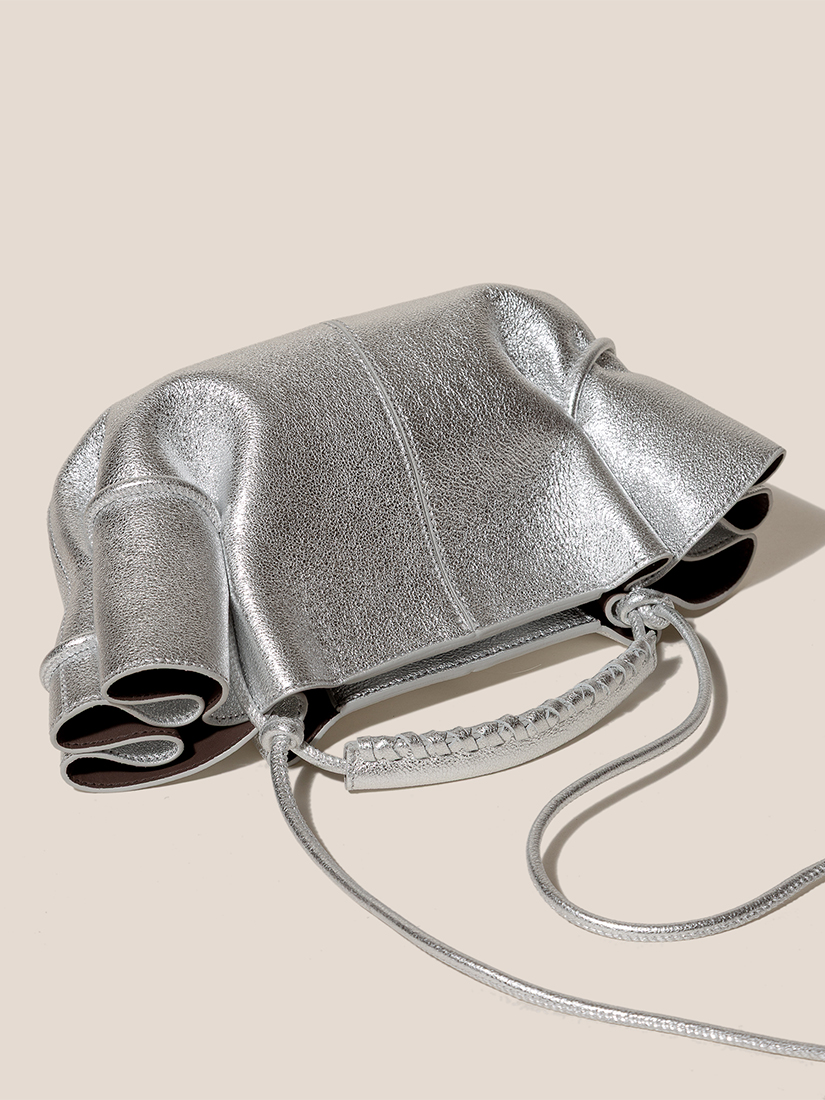 マヨルカ島の丘陵地に位置する町の名を冠した「Arta Mini」(アルタミニ)。今季はメタリックラムスキンを使用したコレクションが登場。美しく編み込まれたレザーハンドルとサイドのプリーツの印影が美しいバッグです。豊かな立体感をもち、彫刻のような存在感を放ちます。持ち手のノットを調節することで、クロスボディバッグとしても使用可能な2WAYタイプ。