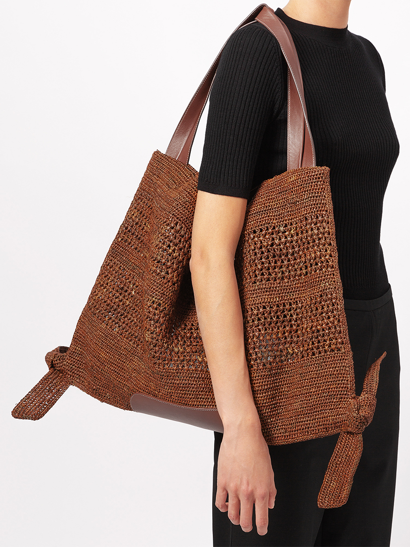 天然ラフィアで編まれたゆったりとしたショルダーバッグ。柔らかなカーフレザーのハンドルです。