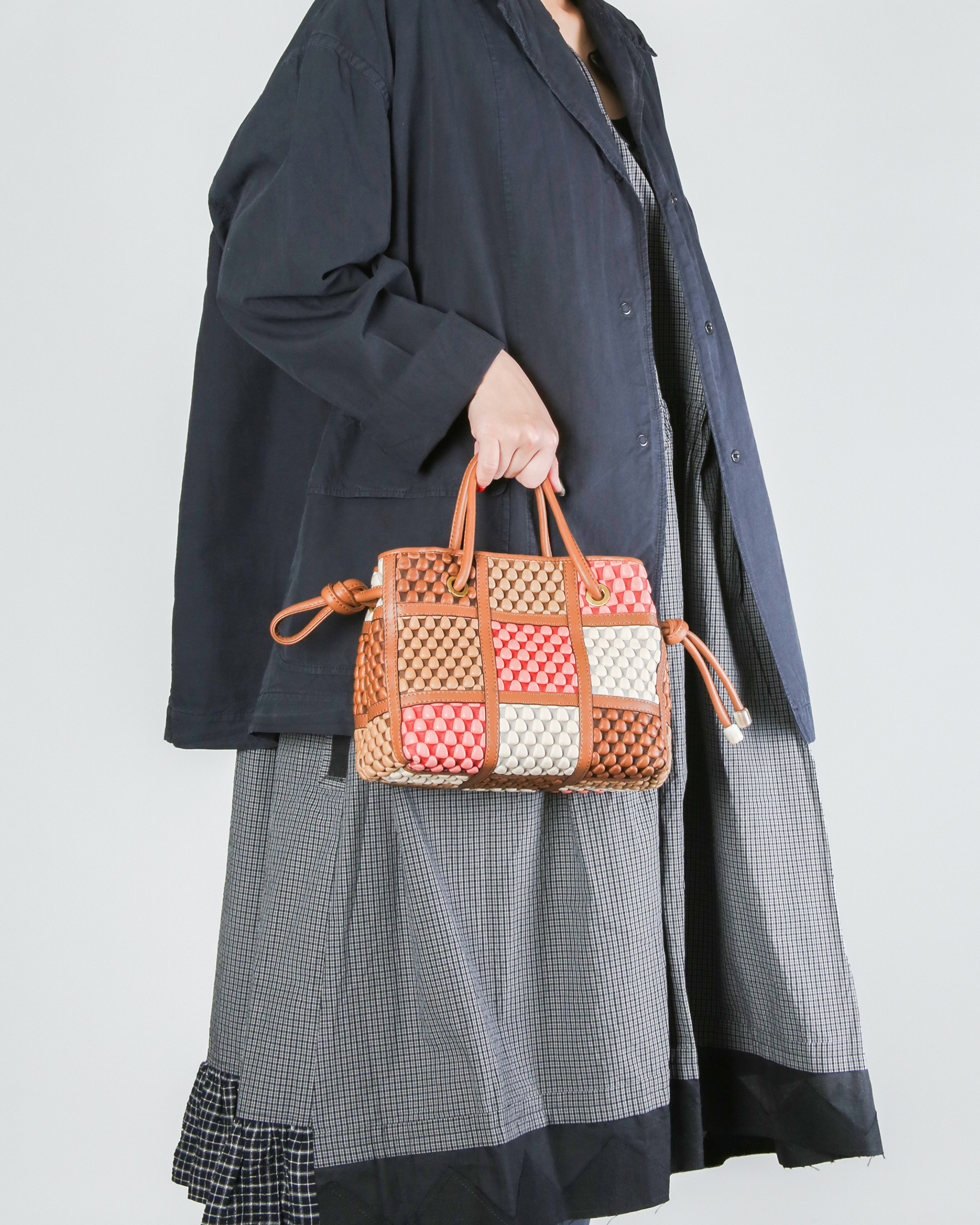 複数のカラーのレザーをパッチワークで組み合わせた、格子柄が印象的なバッグ。コンパクトなサイズながらマチのあるボックス型で、荷物を整理しやすいデザイン。取り外し可能なストラップ付きで、斜め掛けとしても使用可能。
