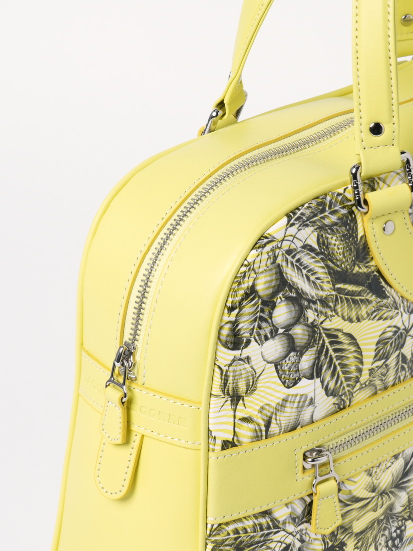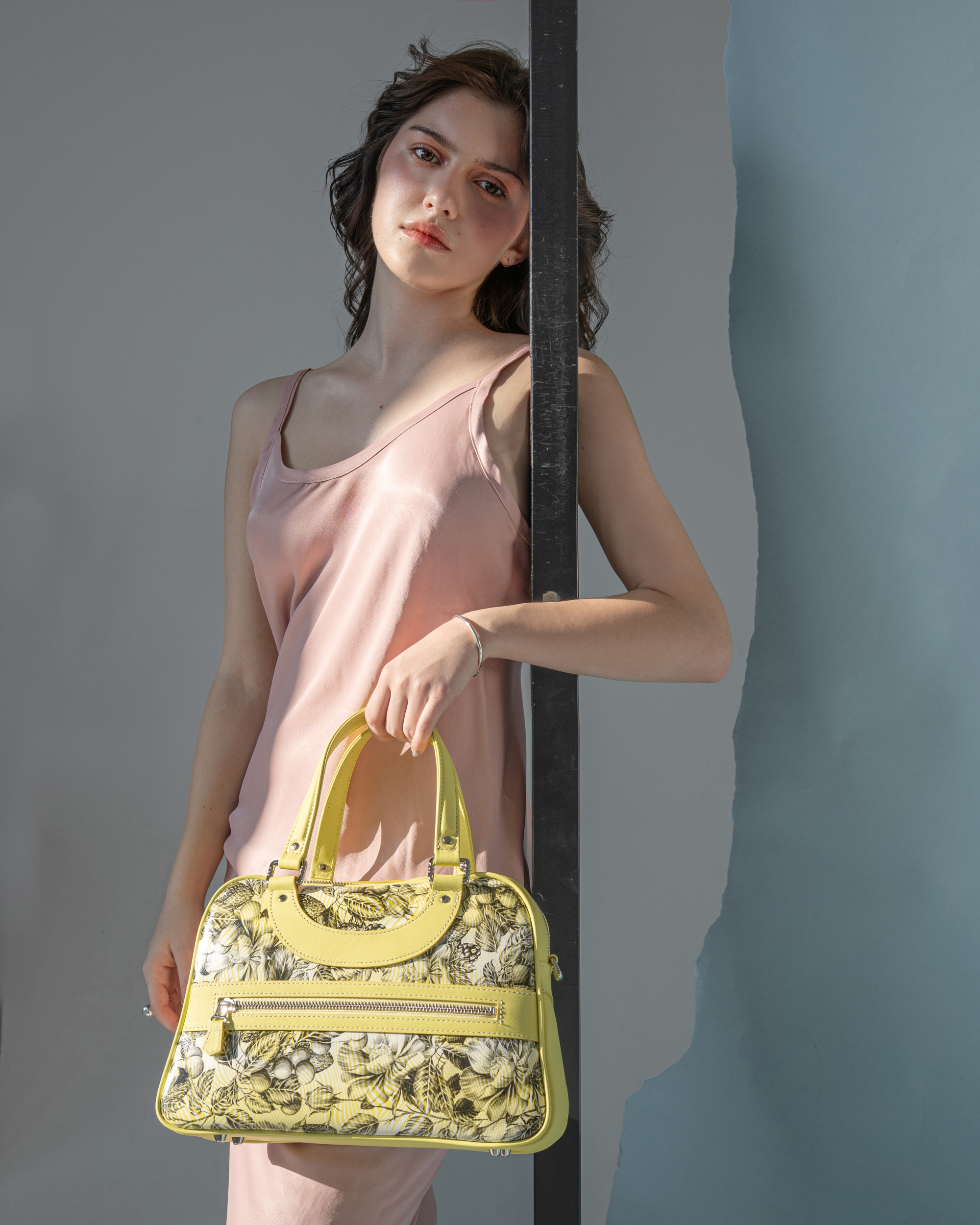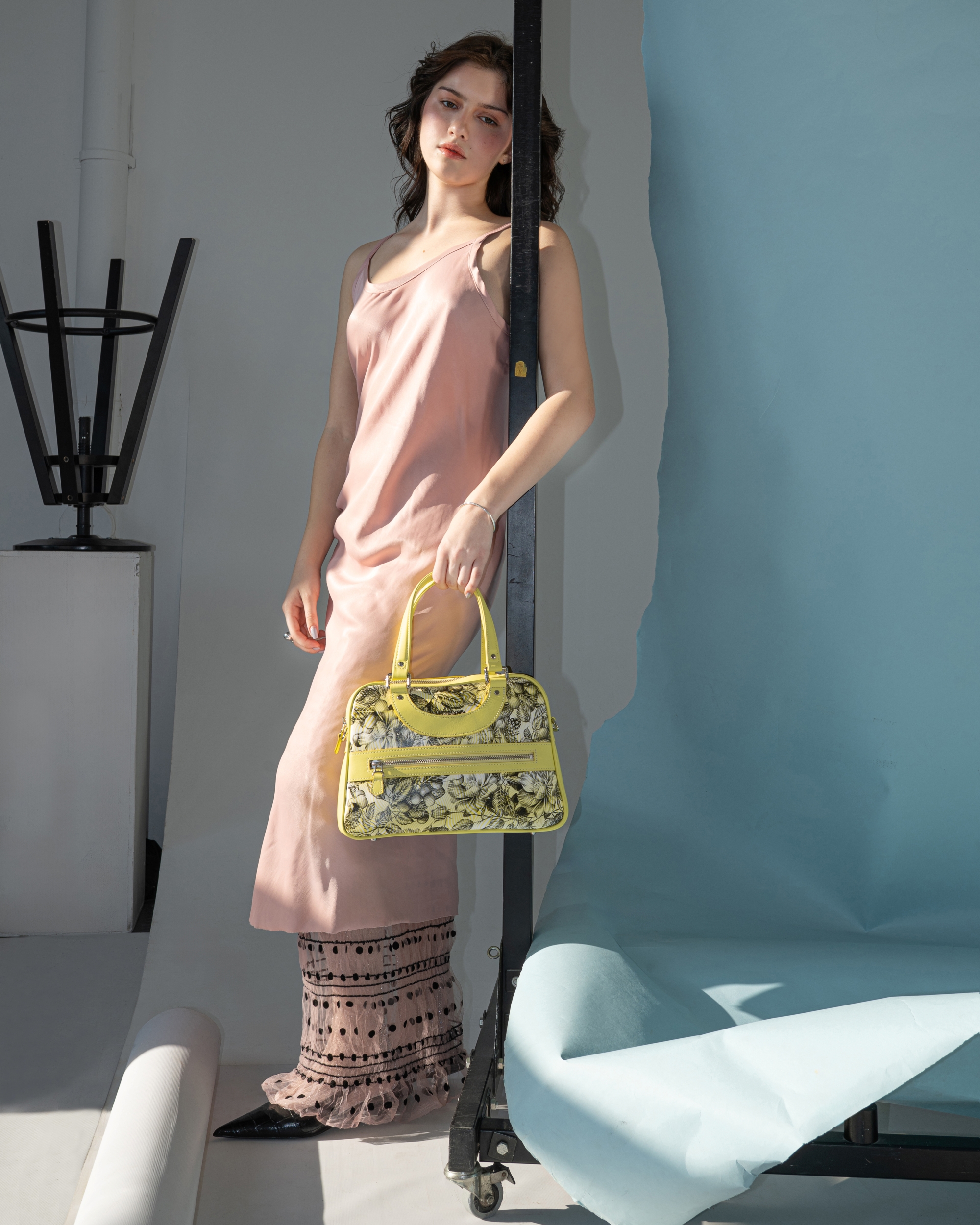 イエローを基調としたフローラルプリントに、同色系のレザーを組み合わせたデザイン。