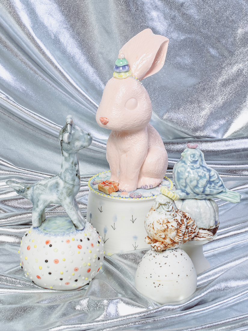 2009年陶芸アシスタントを経て、独立。愛知県常滑にて作陶。2012年神奈川県へ移窯。様々な種類の土と素材を組み合わせ、雨粒のようなドット、動植物をモチーフに装飾がされた陶器を制作。雨の時の霞んだ色をパステルで表現しています。土は、記憶をする性質があり、それに自身の幼少期からの記憶や好きを重ね日々制作しています。