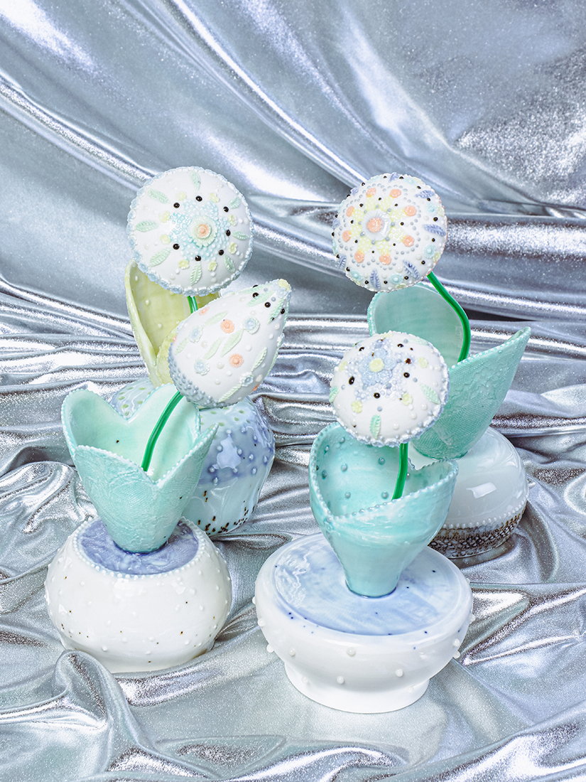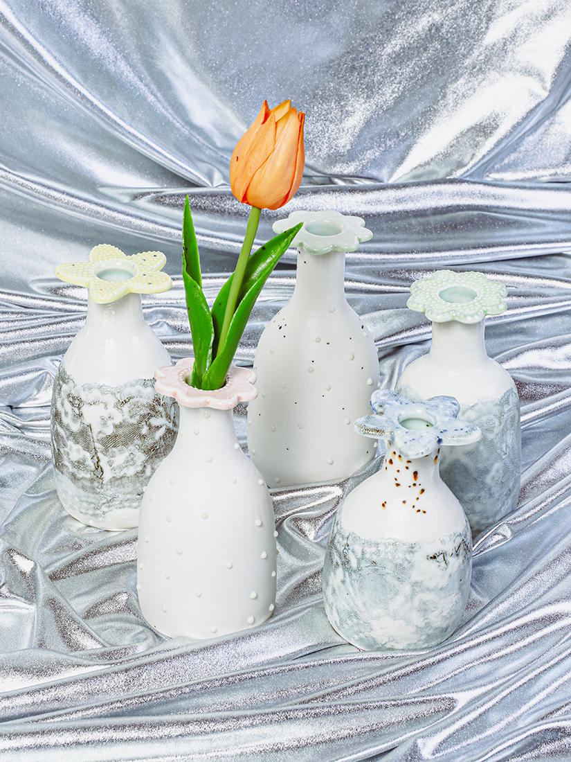 花器やオブジェを中心に、ぽってりとした質感や粒粒の装飾が印象的な一点ものが並びます。