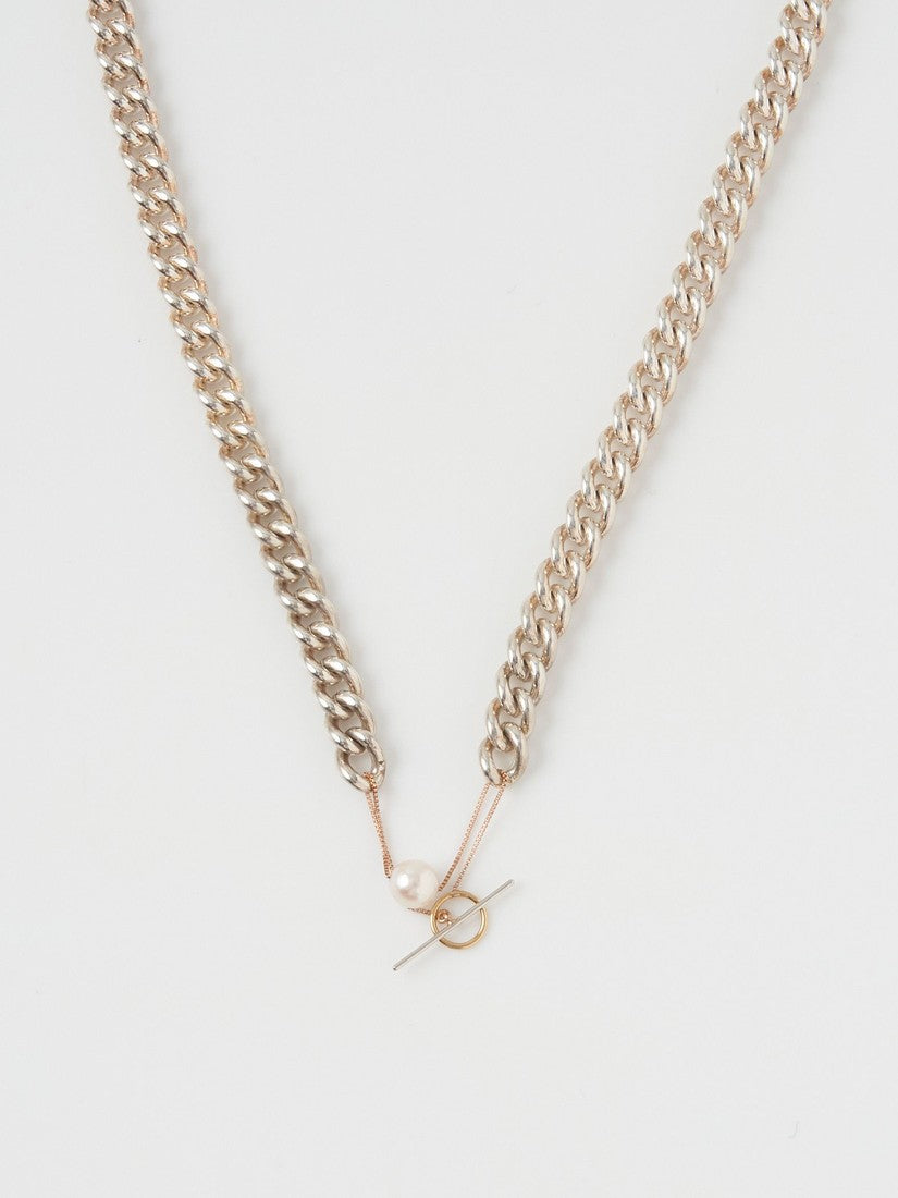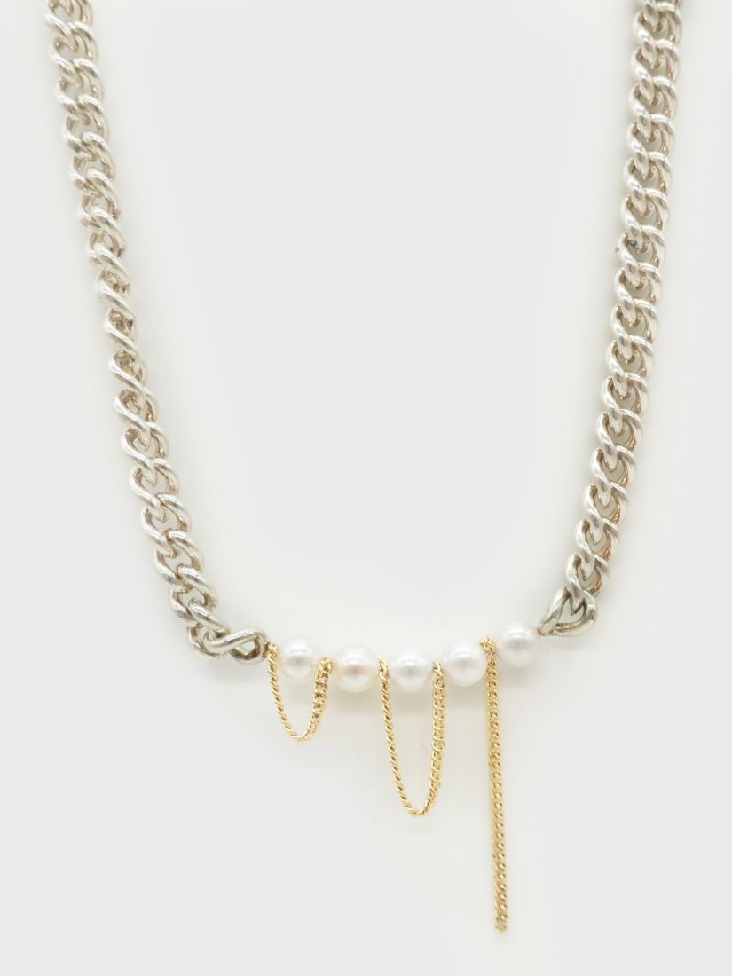 タフなチェーンリングにパールを融合させ、強さの中にも繊細な女性らしさをプラス。 シルバーの爽やかな輝きと18Kゴールドの華やかさ、パールの繊細なつや感。 3つの異なる要素が 絶妙なバランスで組み合わさったデザインは、まるでアートのよう。 いつまで見ていても飽きのこない、ハイセンスなアイテムです。