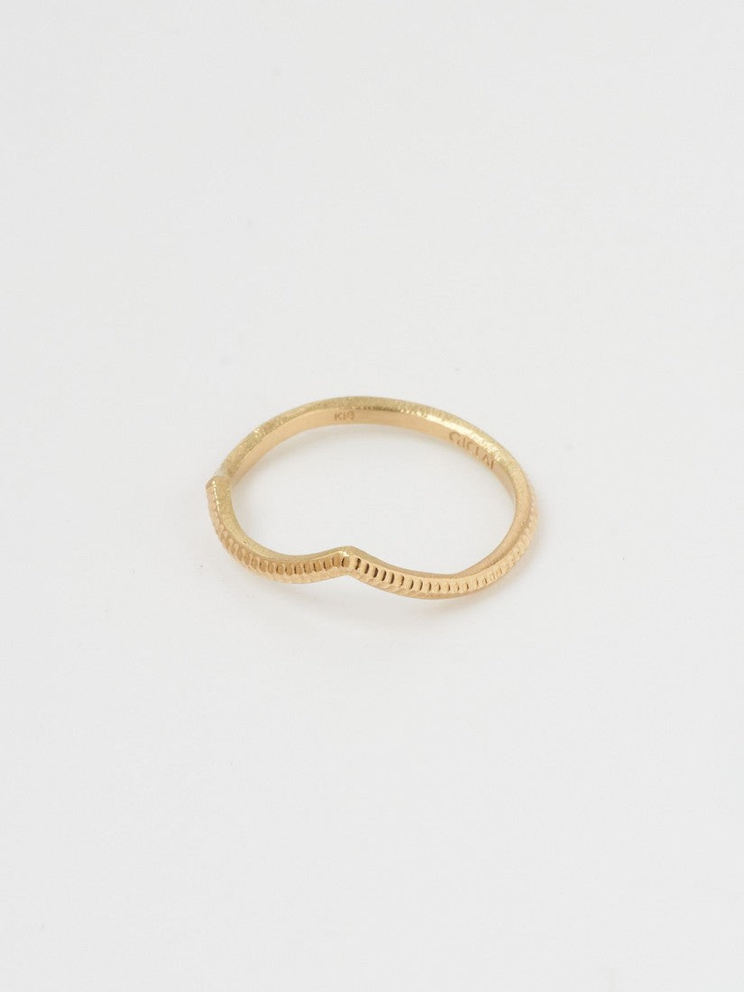 ゴールドの美しさをシンプルに表現し、 ひとつひとつに手彫りでテクスチャーを入れるため、 ゴールドの輝きを存分に感じられるような仕上がりを追求。 ダイヤモンドが入っていなくてもキラキラした輝きを感じられ、 光に当たるとゴールド特有の煌めきが とても美しいデザインです。 指が綺麗に見える細身なリングは、 ユニークな曲線を描きながらも しっくりと指になじみ、 重ね付けも楽しめるよう考えられています。