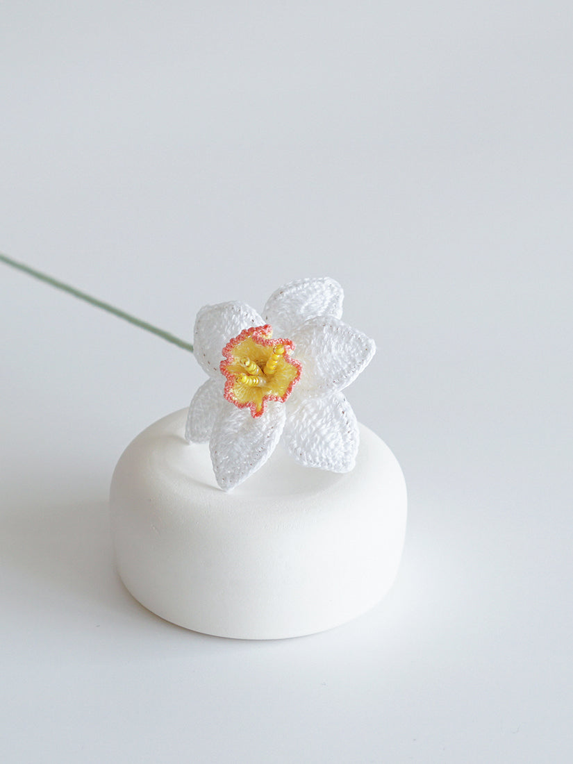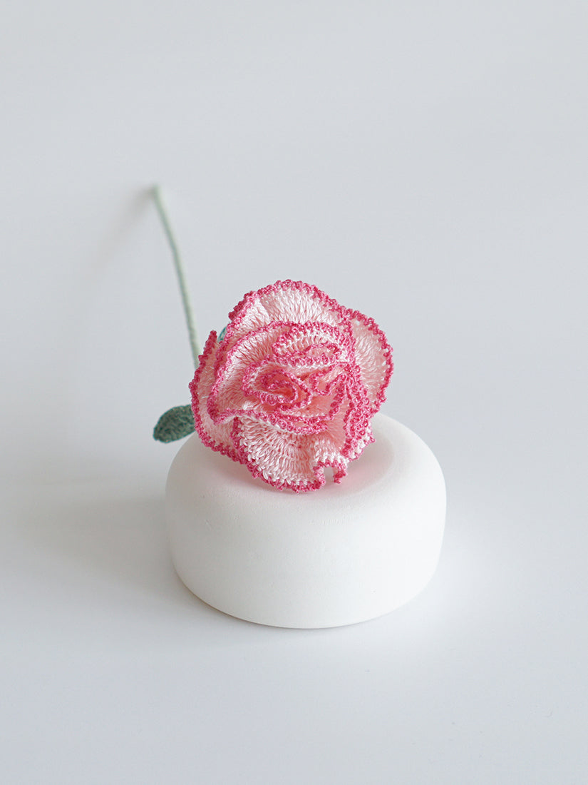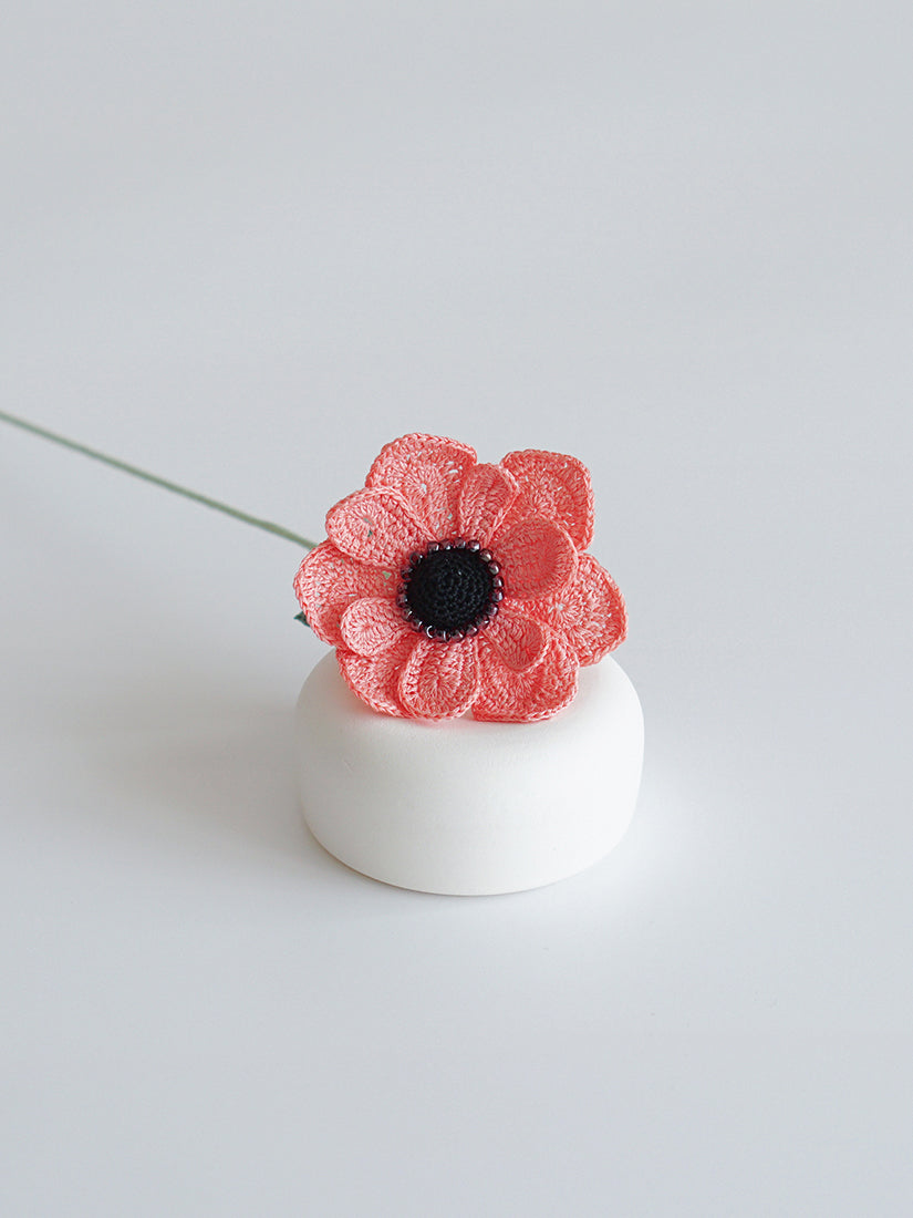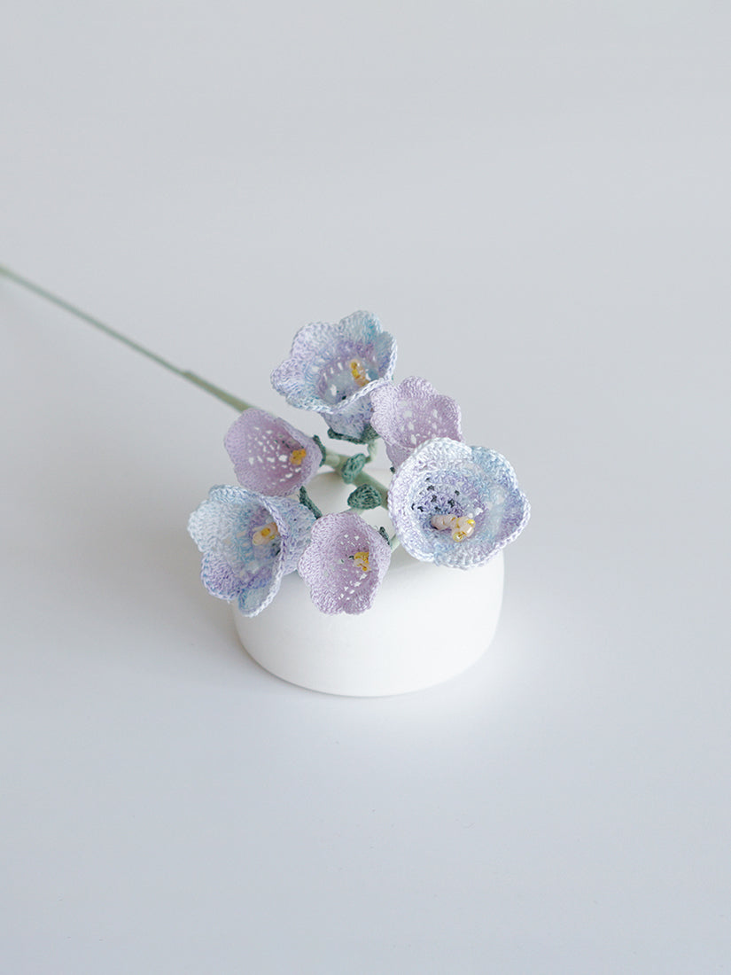 “ayane”が制作する繊細なレース糸で編む手のぬくもりがこもったクロッシェフラワーは、花びら一枚一枚から丁寧に編み上げた、いつまでも枯れないお花です。