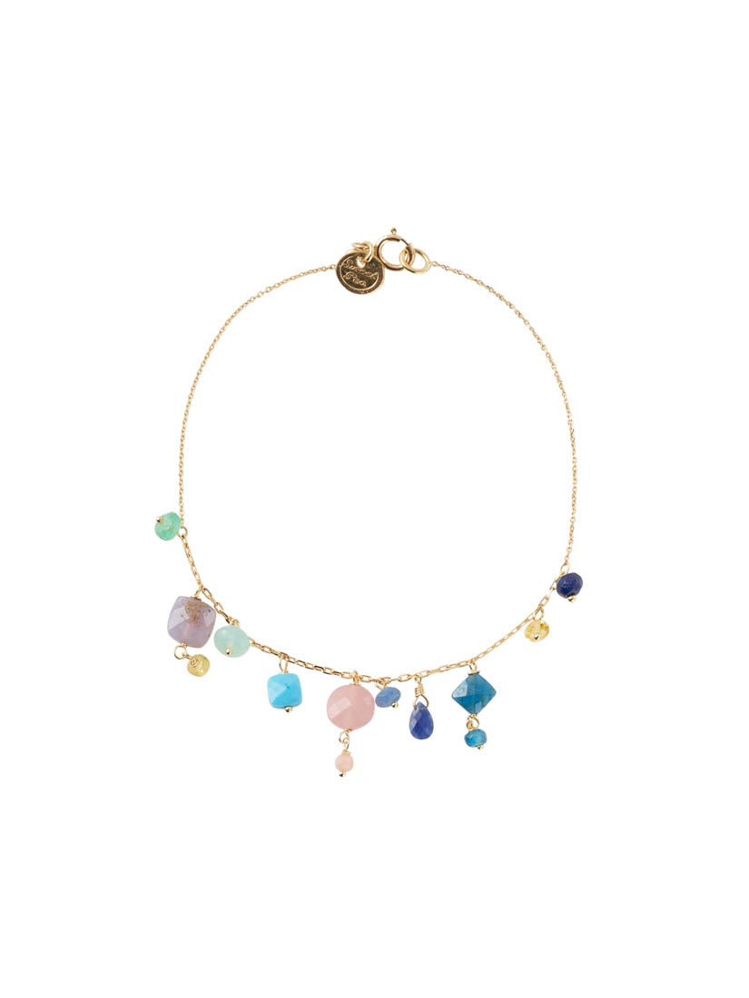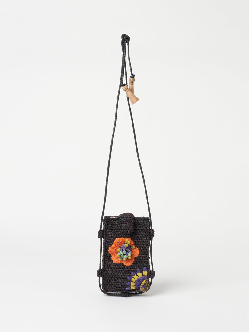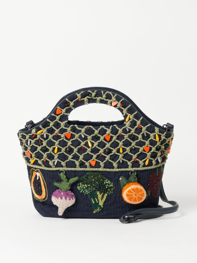 移動中もらくちんなアンティパストのゆったりとしたデニムパンツには、同じくデニム素材のジャマン・ピュエッシュのバッグをコーディネート。バスケット型は収納力もバッチリで、ビーズで飾り付けられたカラフルな野菜や果物のモチーフが存在感を放ちます。