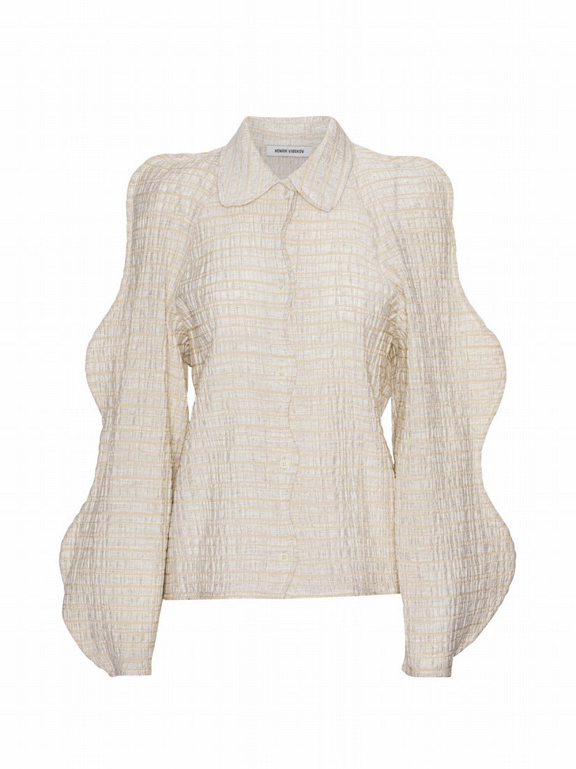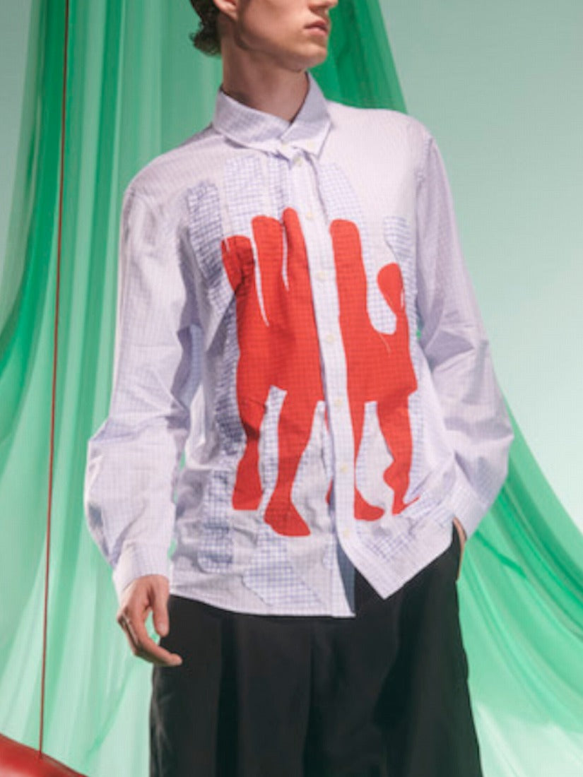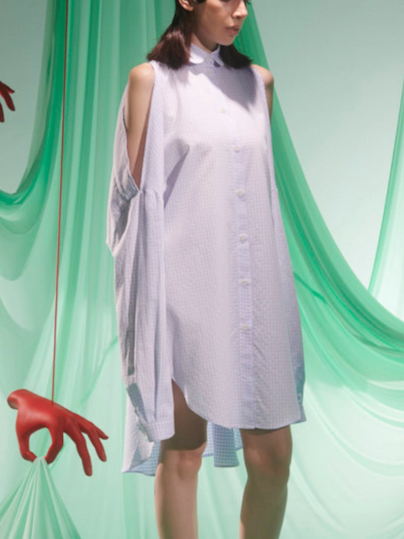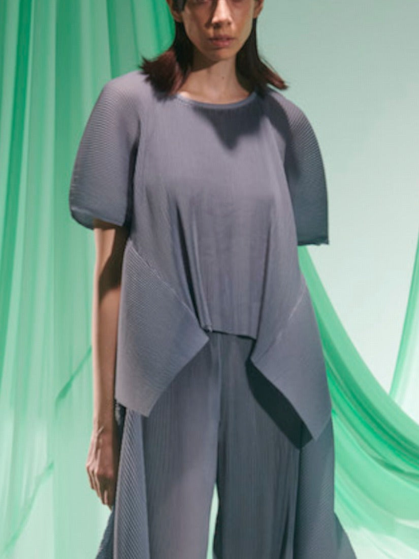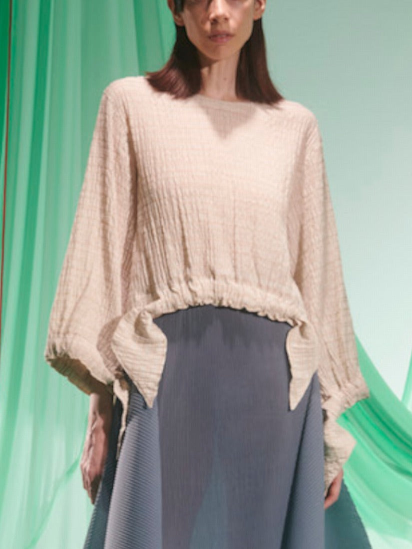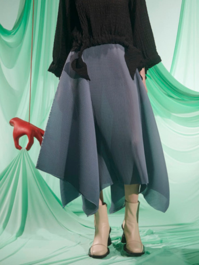 グレーのアウトライン・フィンガーは Dutel の30年前のアーカイブ素材を利用した、指が絡み合ったようなスモックのようなシワのある独自開発のテキスタイル。