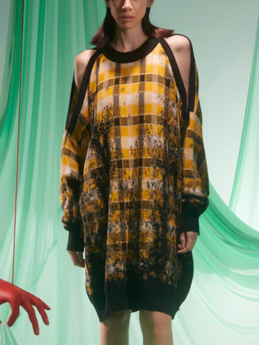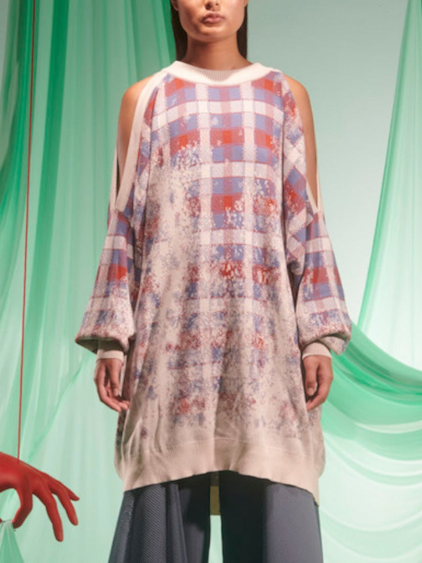 古典的チェックを分解することで、ジャカード織りの生地では海のモチーフに姿を変え、チェック柄のニットでは柄が完全に溶けてしまうようです。