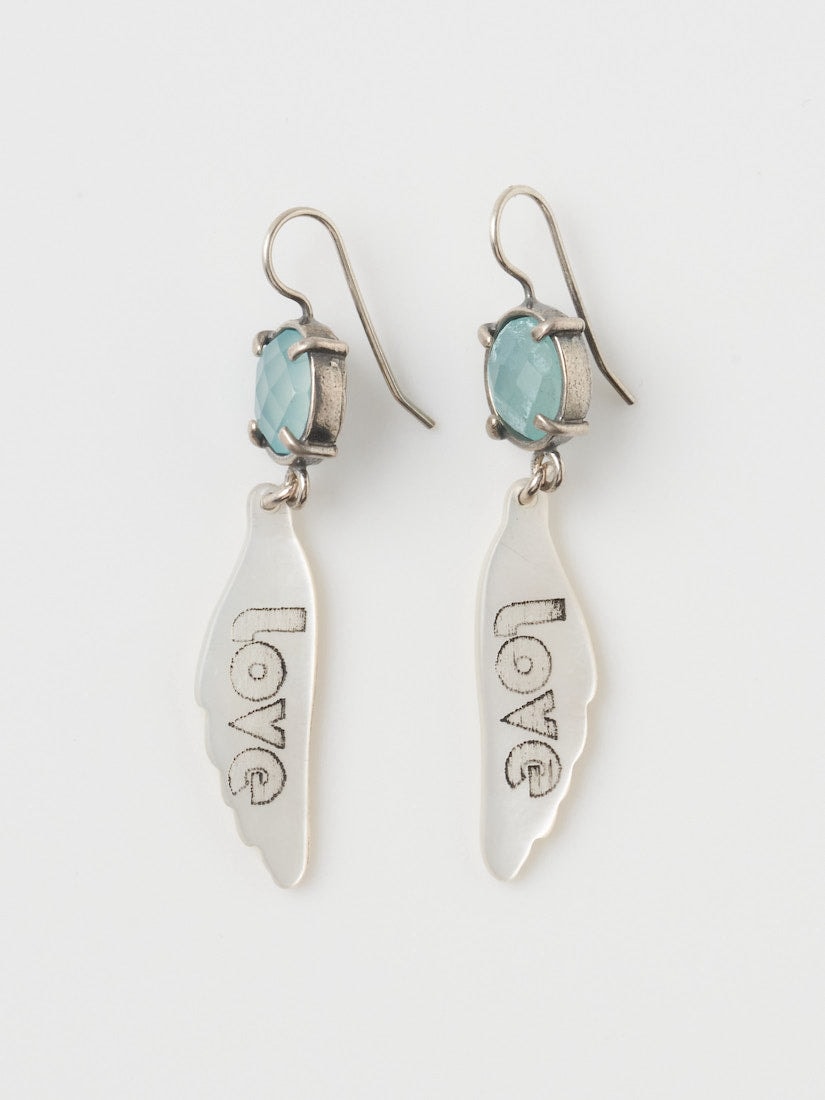 初夏には軽やかに揺れるシルバージュエリーも注目👀Gem Kingdom(ジェム・キングダム)のLoveの文字が施されたマザーオブパールの羽根モチーフピアスには甘くなりすぎない重厚感のあるシルバーネックレスのレイヤードも素敵です。