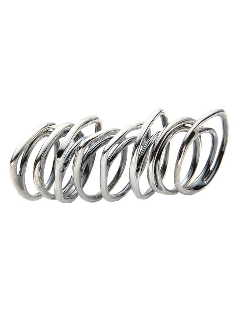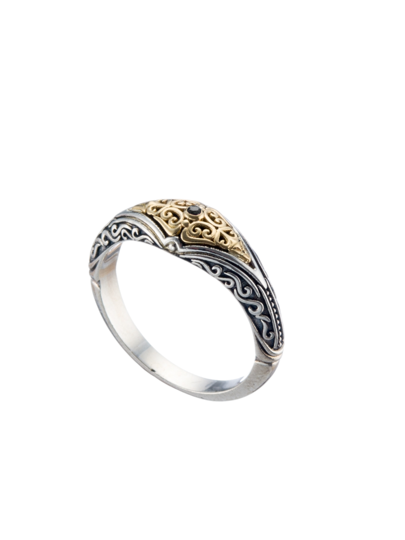 クールに手元を飾るジュエリーコーディネート。手彫り職人による透かし模様が施されたGEROCHRISTO(ジェロクリスト)のリングは、シルバー×18Kゴールドとのコンビネーションでどの角度から見ても唯一無二の美しさ。そっとセッティングされているブラックダイヤモンドもポイントです。重厚感のあるリングにはシンプルなブラックコードジュエリーも素敵です。