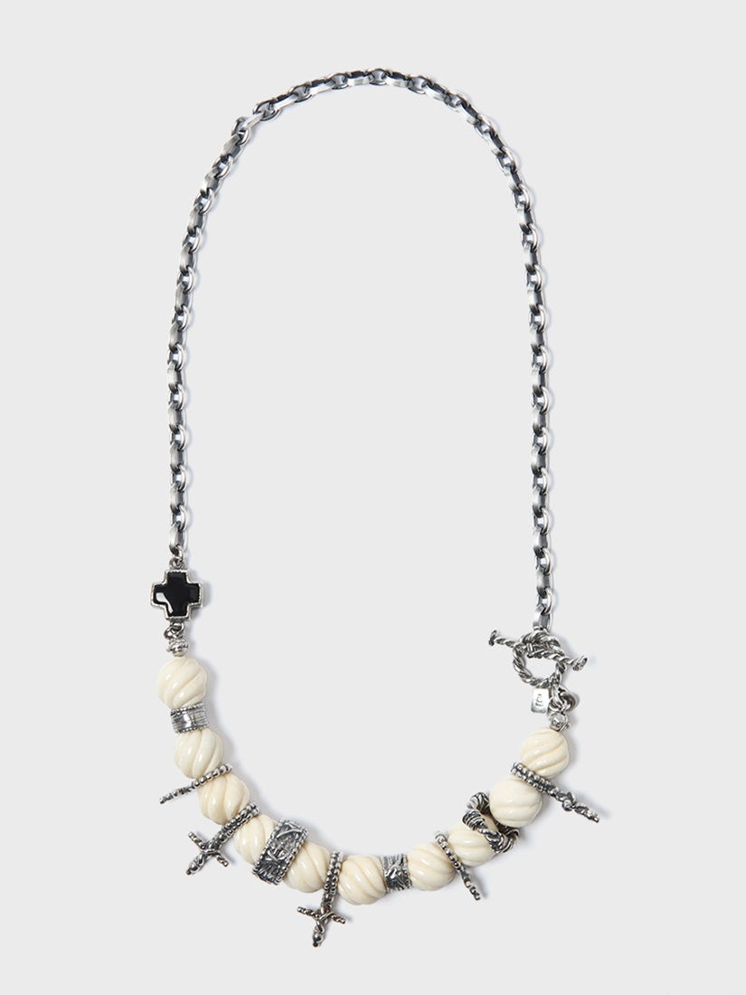 オランダの Gem Kingdom(ジェム・キングダム)がお届けするユニセックスコレクション「Rebel Rebel」のネックレスを主役にコーディネート。それぞれアイテムにはクロスやハート、アルファベットなど愛着の湧くモチーフが用いられています。モノトーンでまとめることで異なるモチーフ使いでも統一感が出ます。