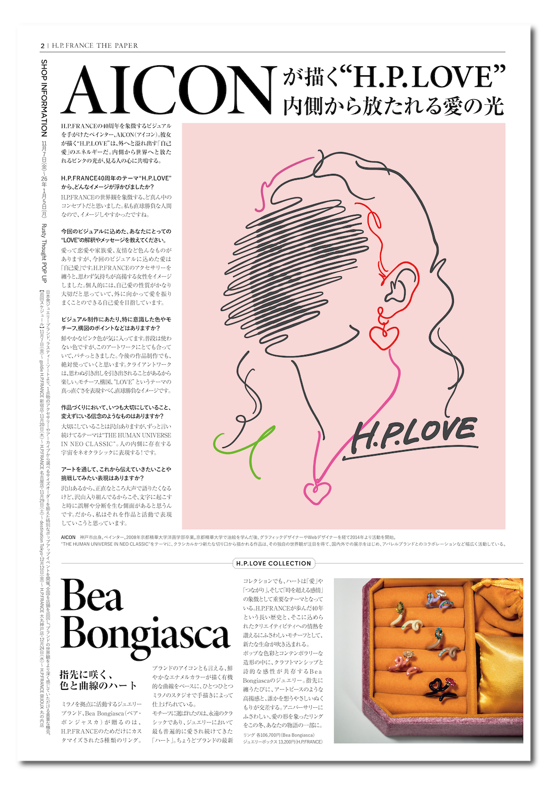2025年11月21日(金)より、全国のアッシュ・ペー・フランス系列店舗および公式オンラインショップにて、一定金額以上をお買い上げいただくとスペシャルノベルティを先着順にてプレゼントいたします。日本人ペインターの「AICON(アイコン)」、フランス発ジュエリーブランド「NACH(ナッシュ)」、そしてスペイン発アパレルブランド「D-due(デ・ドゥエ)」の3組のアーティスト及びデザイナーが、40周年を記念し“H.P.LOVE”をテーマに描き下ろした華やかなイラストを起用いたしました。