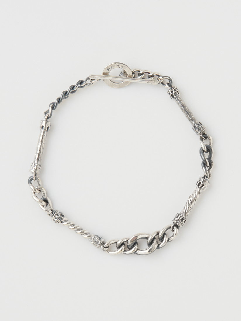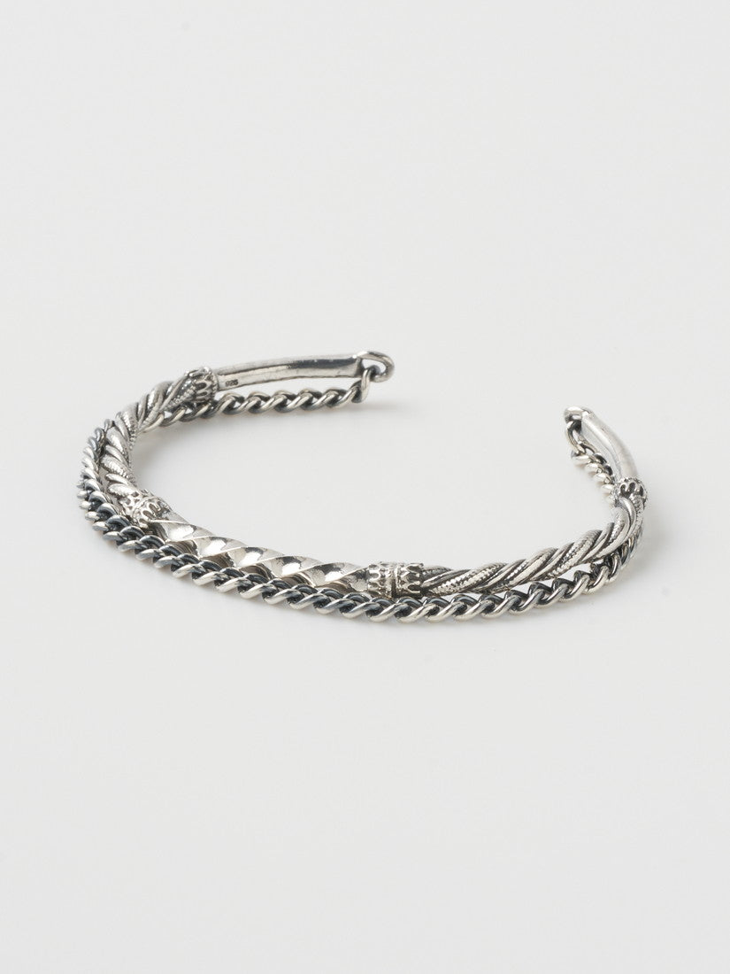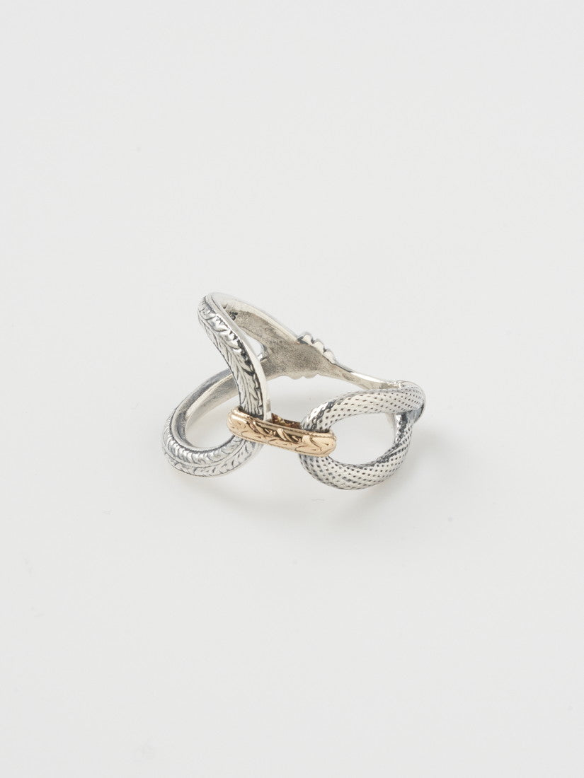 リングはOpen your eyesをテーマにし、目をモチーフにしたアイコニックな2023年春の新作リングを合わせました。非常に大きくゴージャスなボリュームがありながらも、非常に軽く、指の関節の動きを邪魔しない細かな気配りが効いたリングはブランドでも人気のタイプ。人差し指のタイプはゴールドの留め具がついています。薬指のリングは鏡のように輝く表面感が魅力。コーディネートには同じ細工の入ったバングルとチェーンが一緒になった人気のモデルと、ルネサンス彫刻のような美しいオリジナルパーツを使用したブレスレットを合わせました。