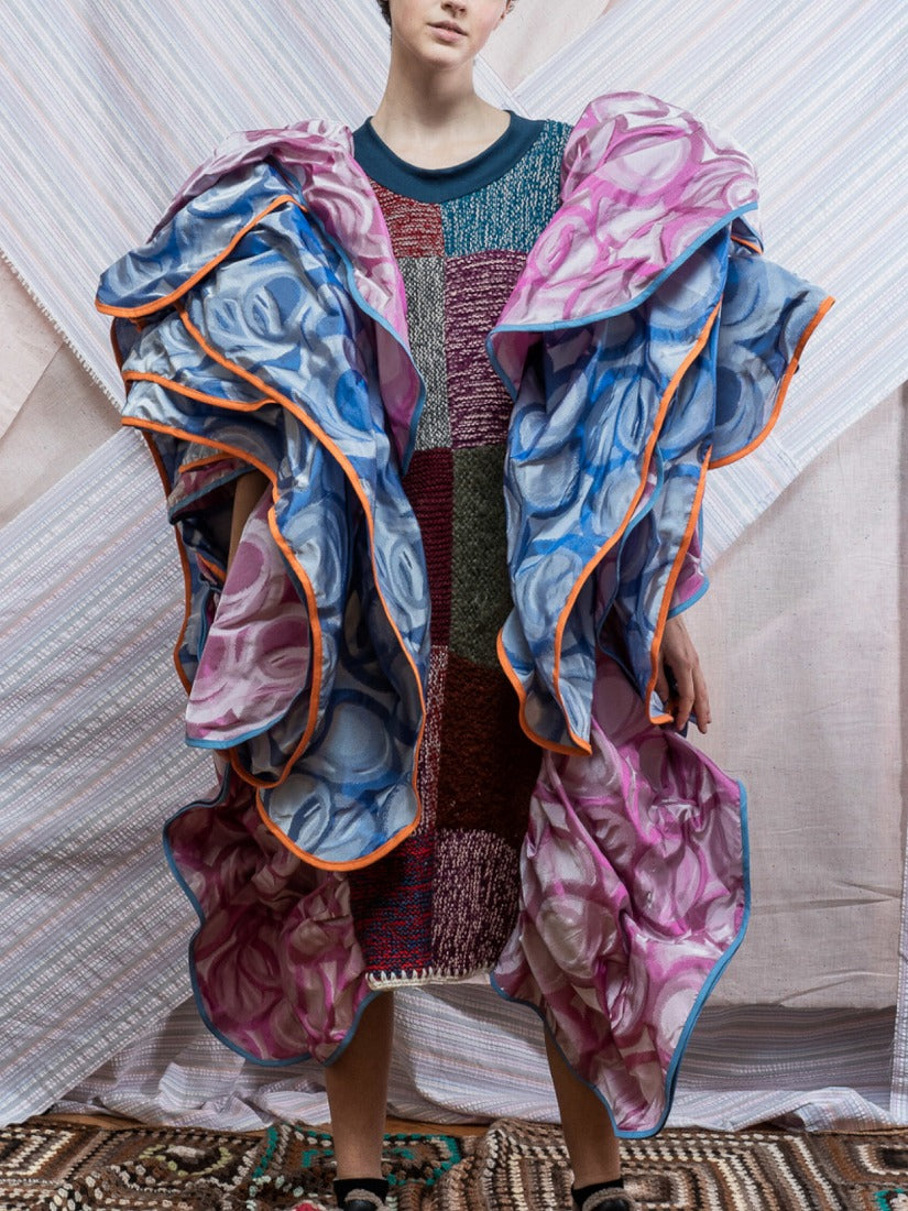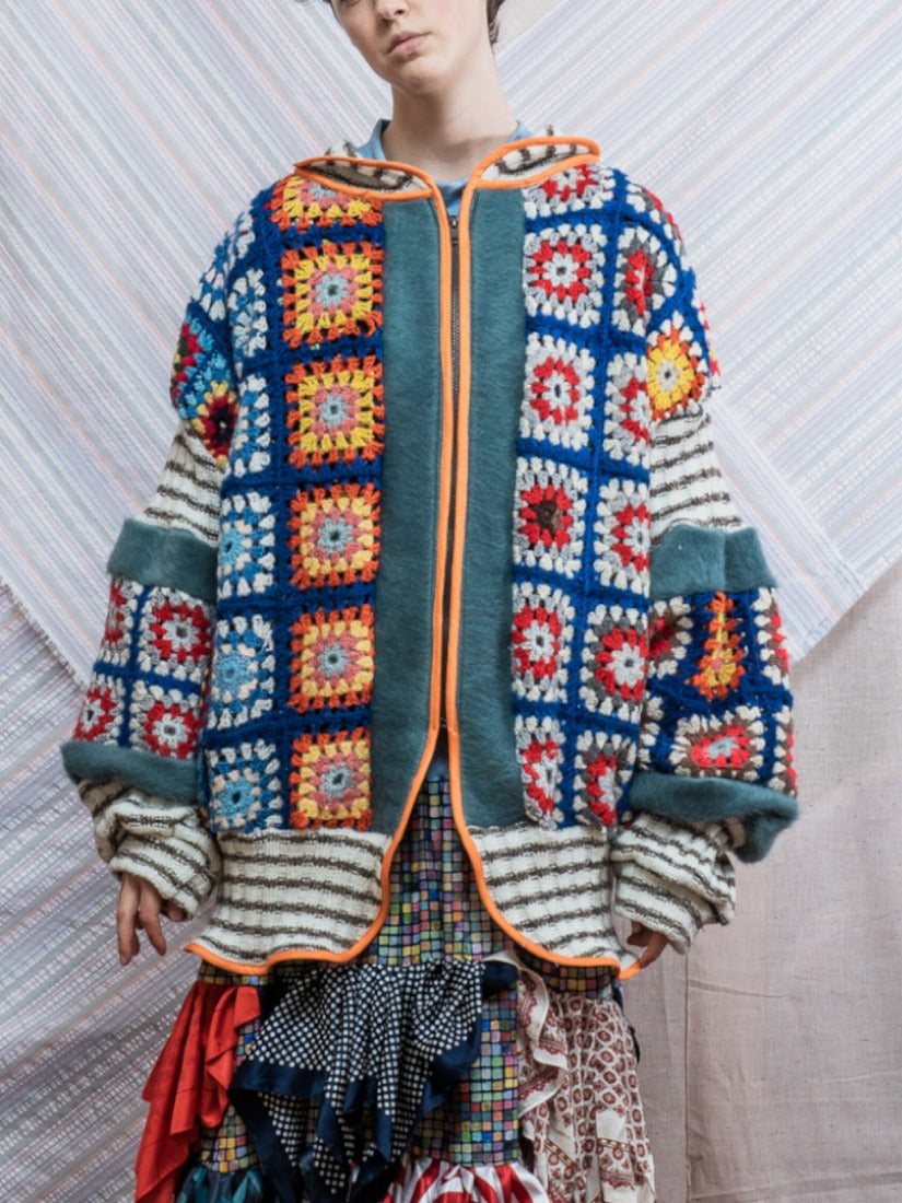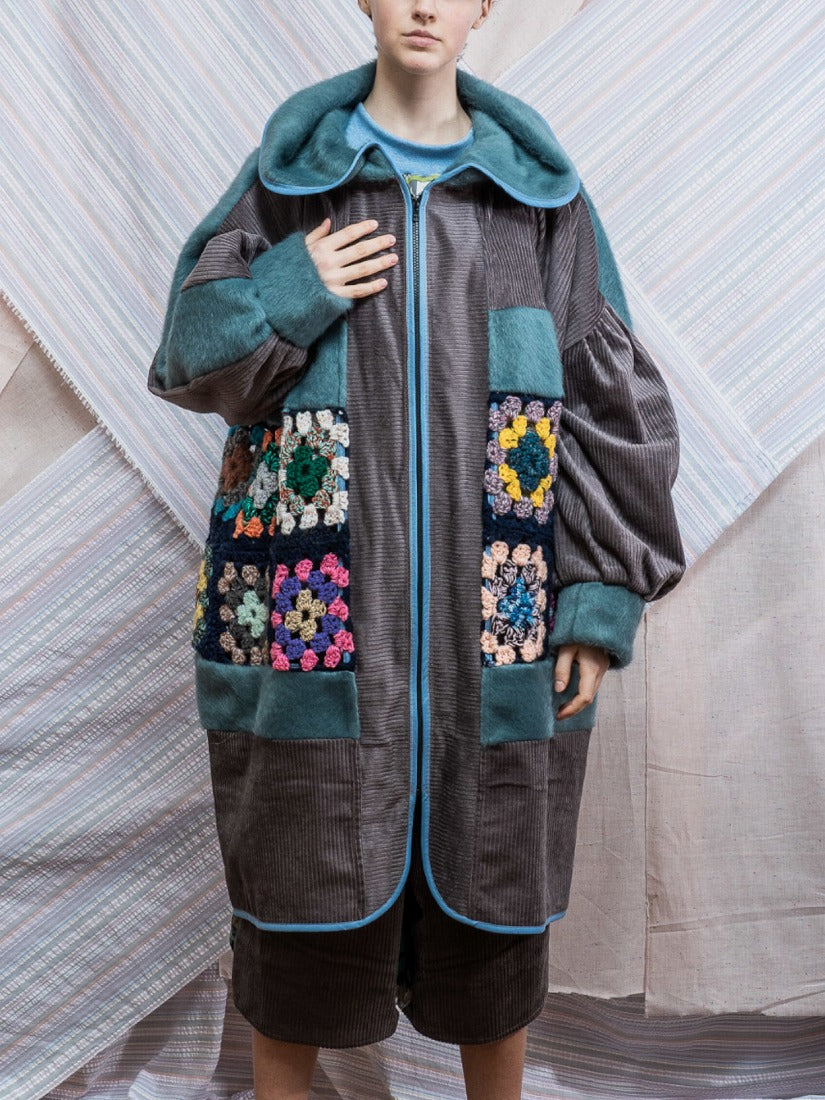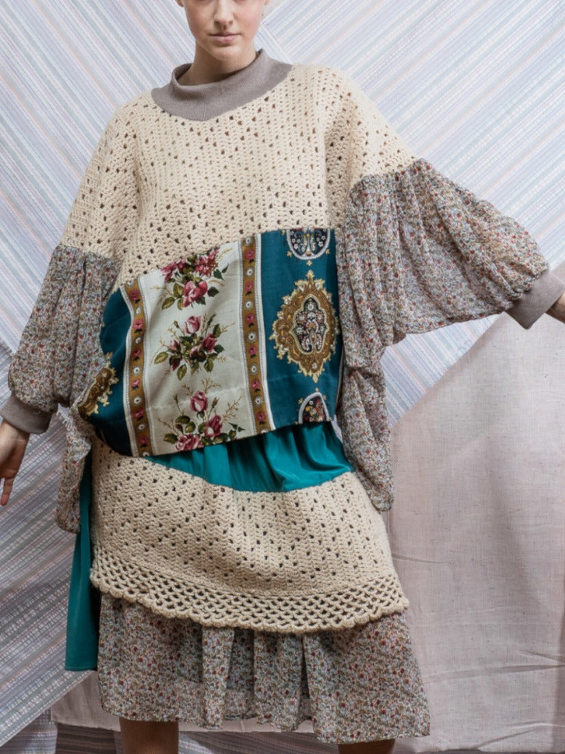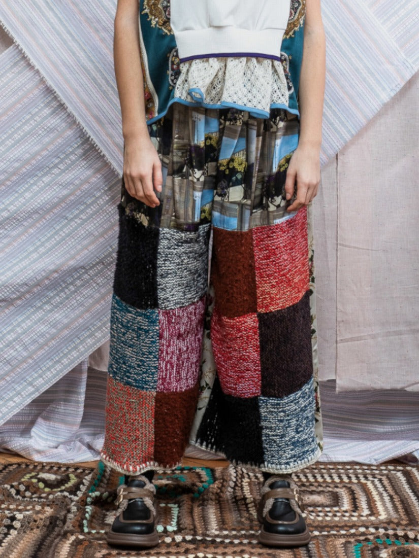 毛布、カーテン、スカーフ、ジャージをメインに古い生地やハンドニットなどを自由にコラージュした