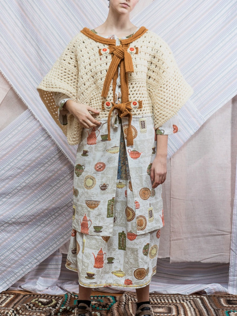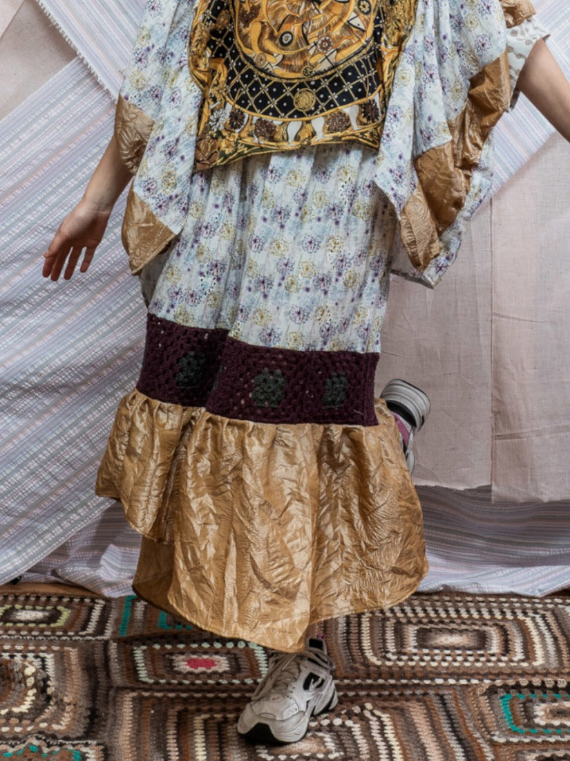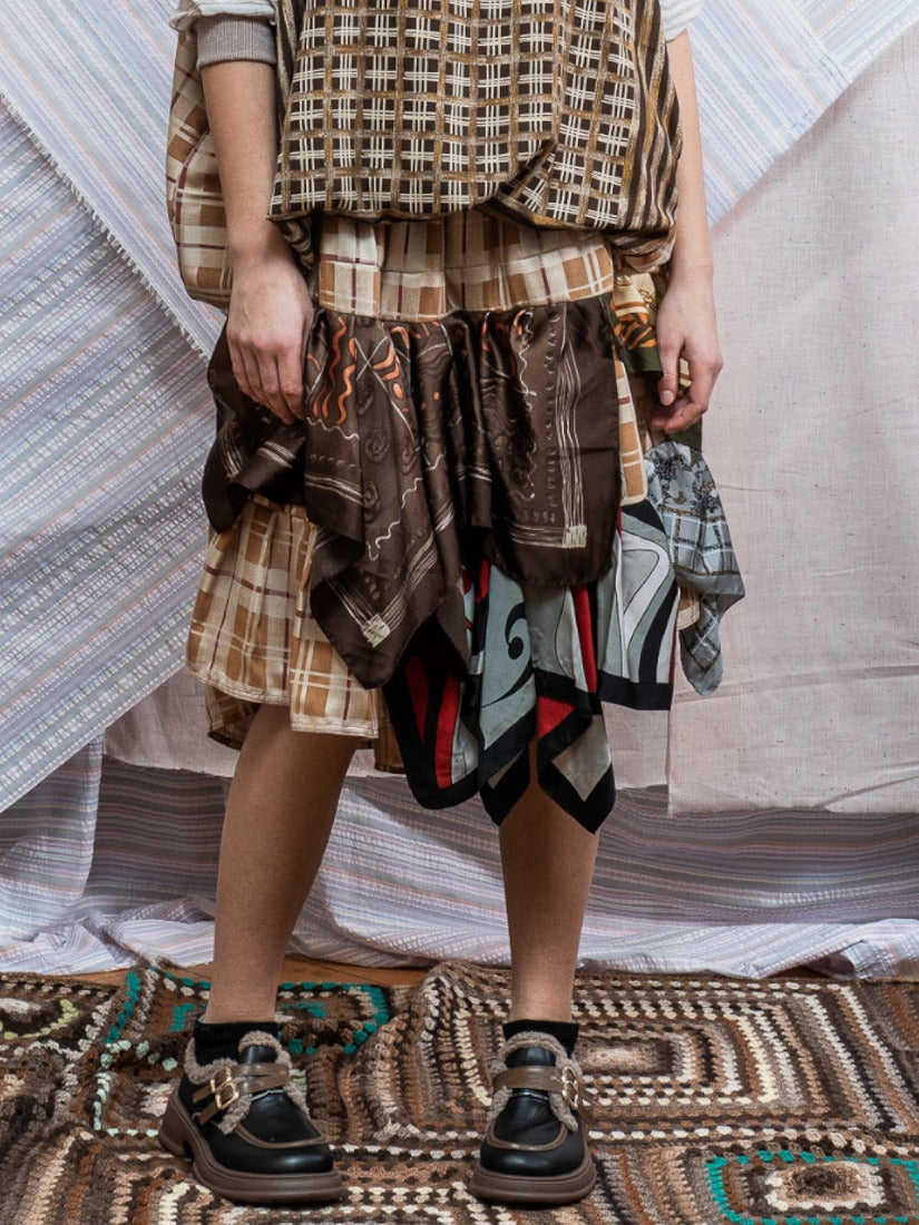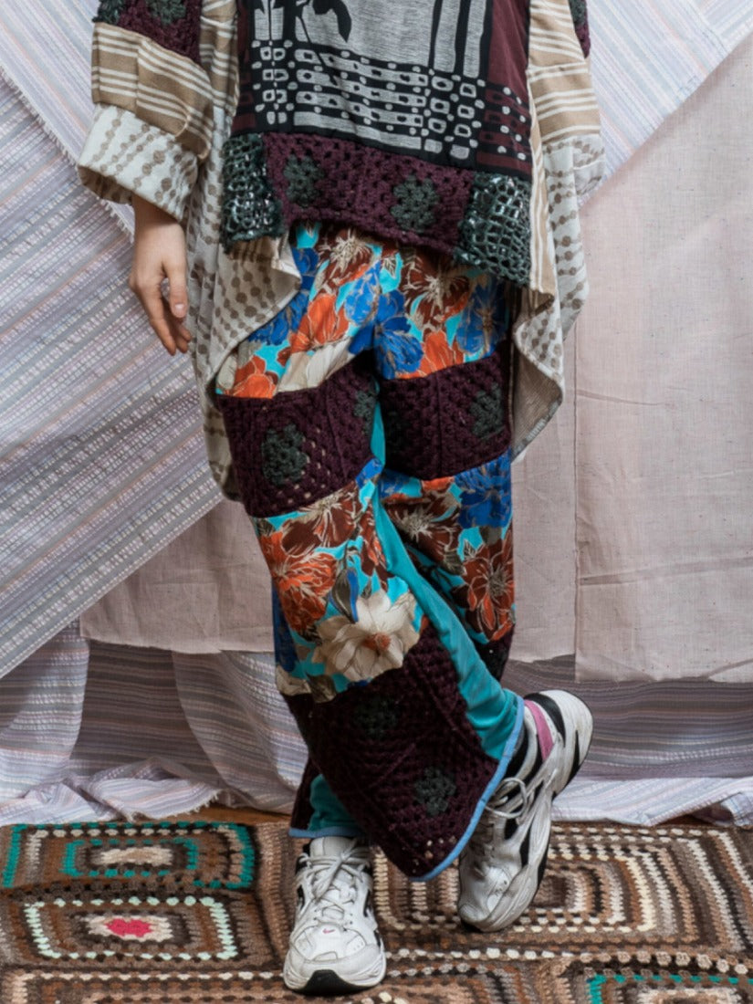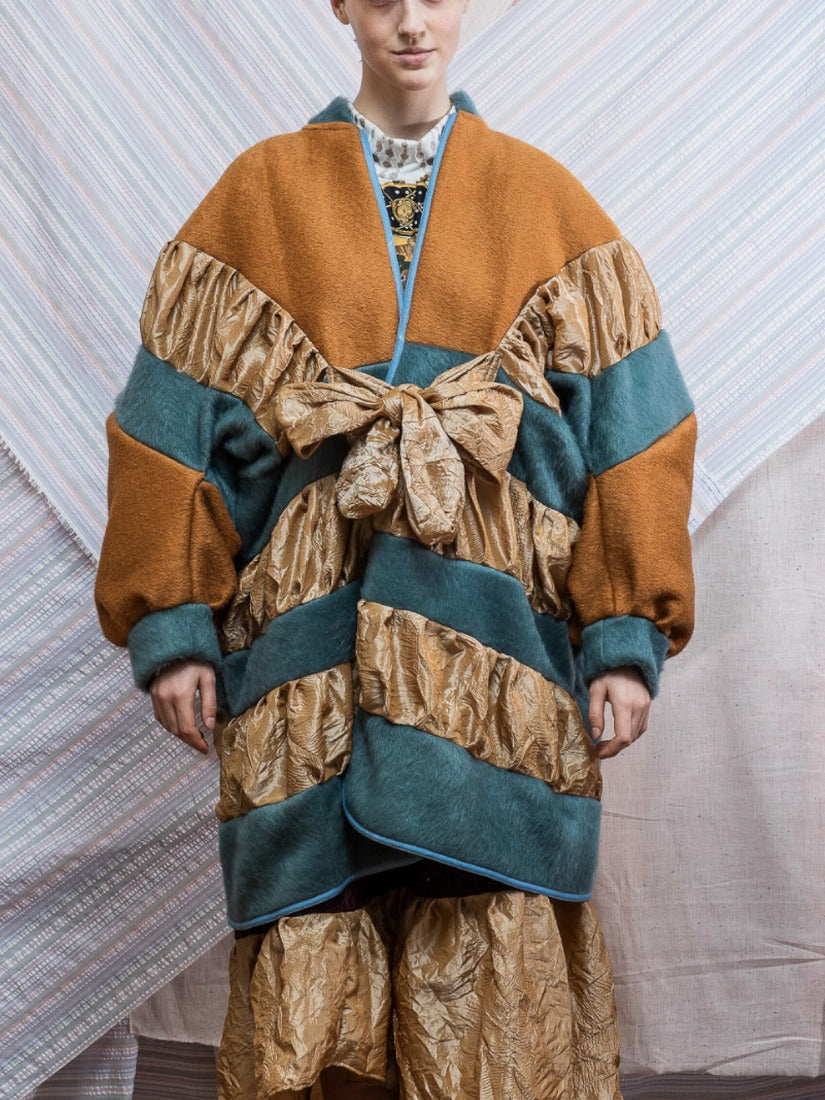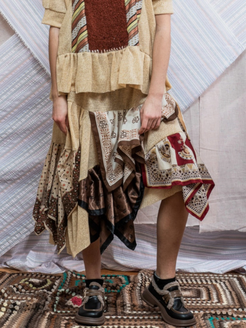 毛布、カーテン、スカーフ、ジャージをメインに古い生地やハンドニットなどを自由にコラージュした