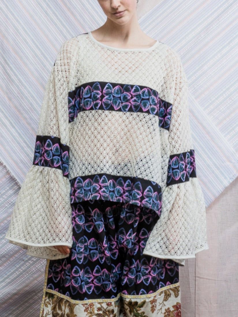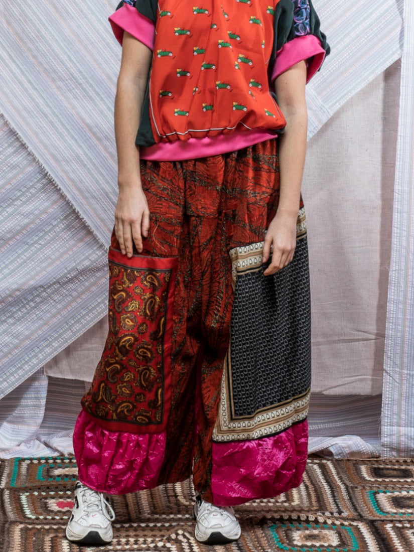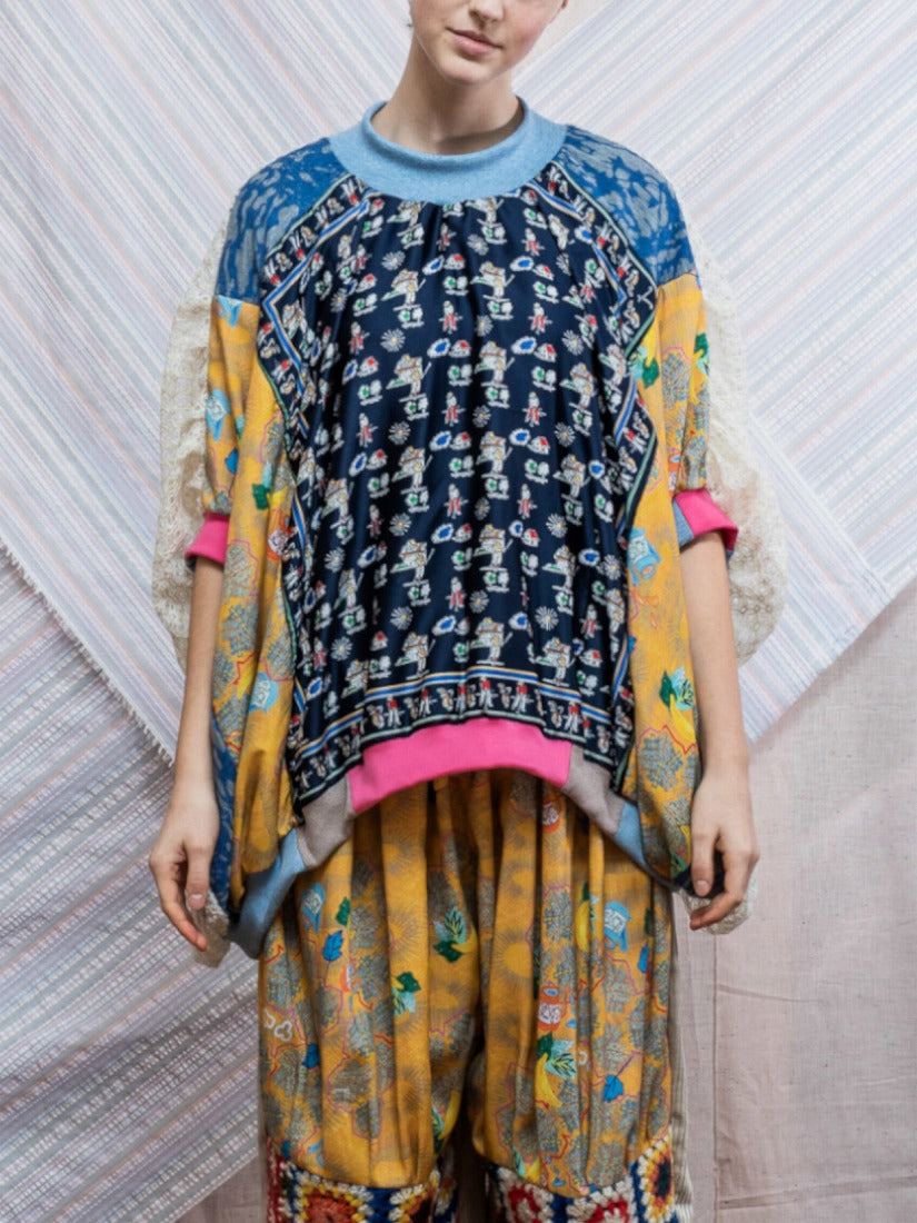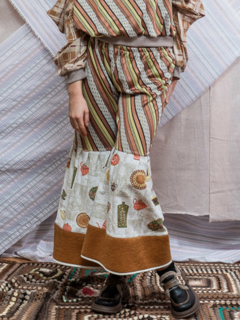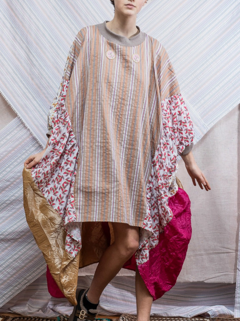 毛布、カーテン、スカーフ、ジャージをメインに古い生地やハンドニットなどを自由にコラージュした