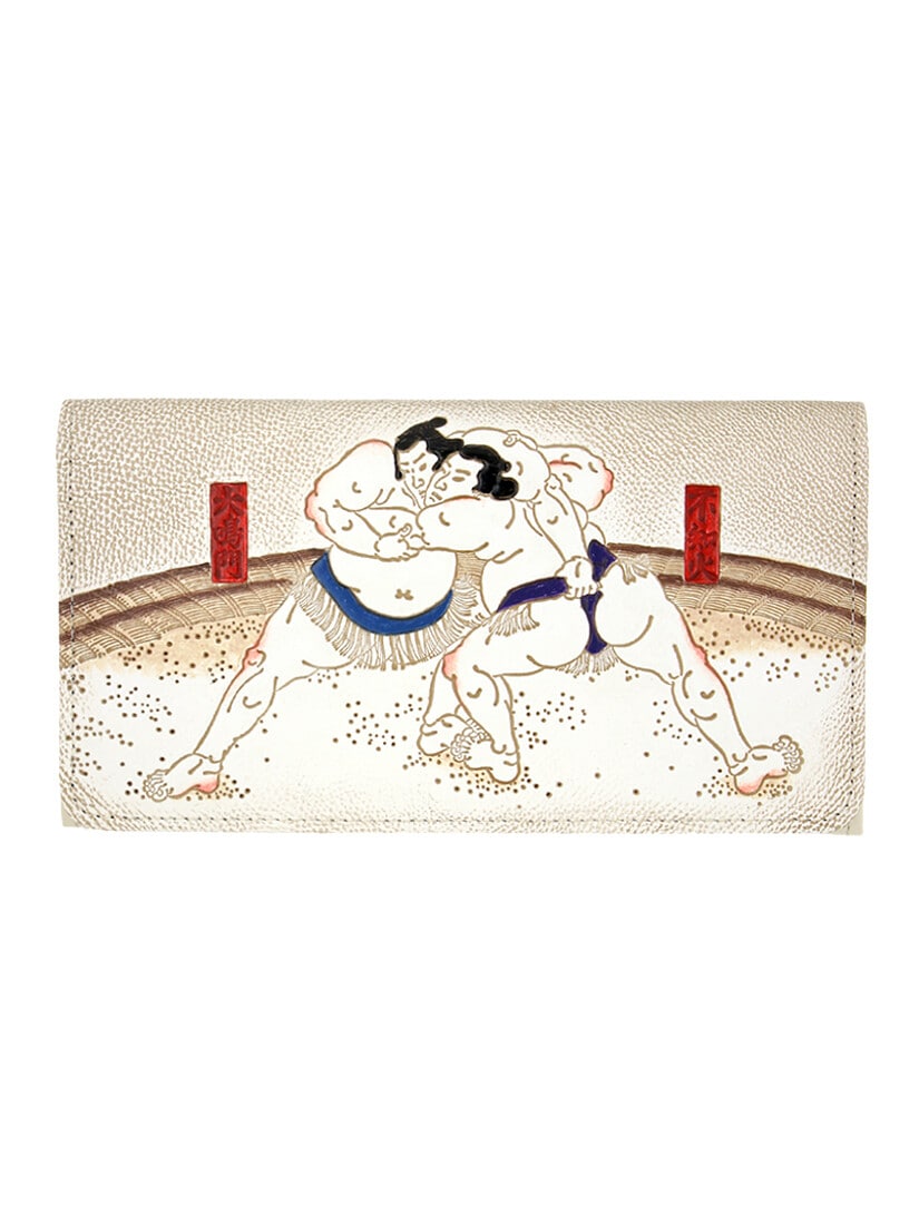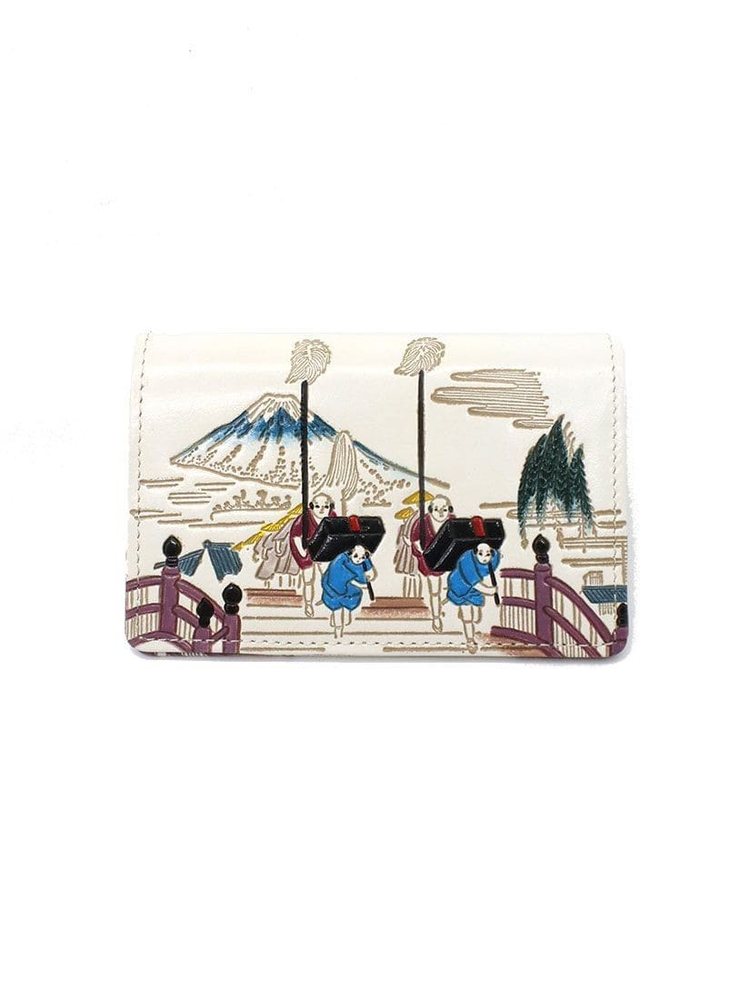 薄く均一な純白の牛革を浮世絵や伝統柄をもとにした銅版型で押す。ぷっくりと立体的に表れたその絵柄を、今度は小皿に分けたとりどりの塗料で、ひと色ひと色、丹念に彩っていく。筆づかい、ぼかし、熟練の技と集中力によって、真っ白な革にいきいきとした世界が生まれて来る。
