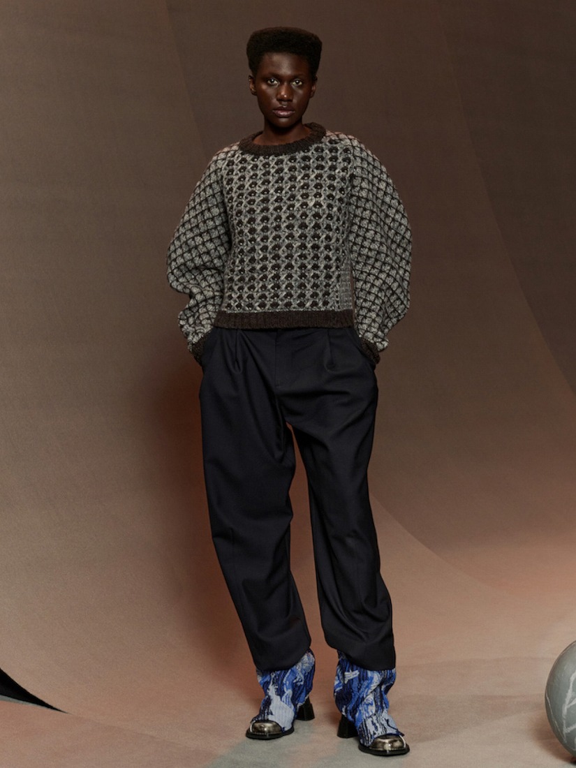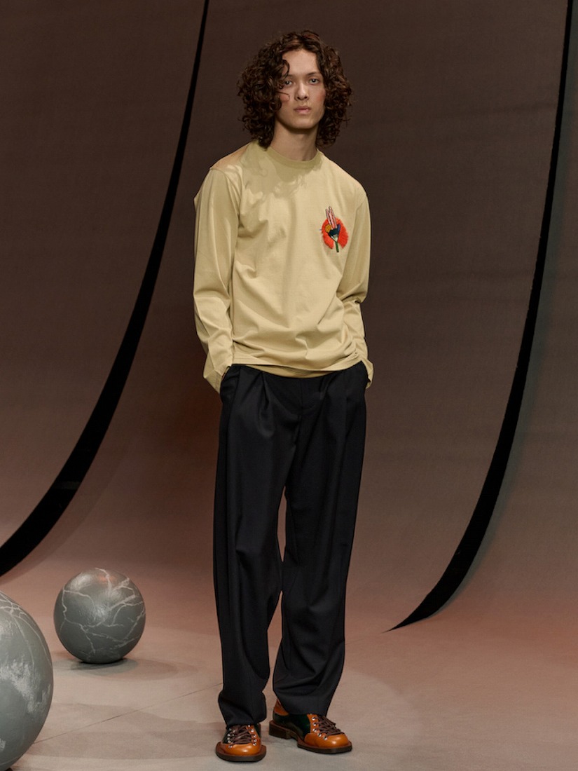 2025AWは「自然と人間の対比」をテーマに、自然を支配しようとする欲望と、自然が持つ穏やかな自己保存の力とのせめぎ合いを描く。山岳地帯や動物から着想を得た機能的なアウター、足跡や漁師などをモチーフにしたテキスタイル、アースカラーにオレンジやサルファーイエローを差し込んだ色彩が特徴。コペンハーゲンのシアター・レピュブリックで行われたショーでは、音楽や舞台美術が融合し、幻想的な風景が動き出すような空間を創出。再利用された舞台装置が、持続可能性のメッセージも伝えている。