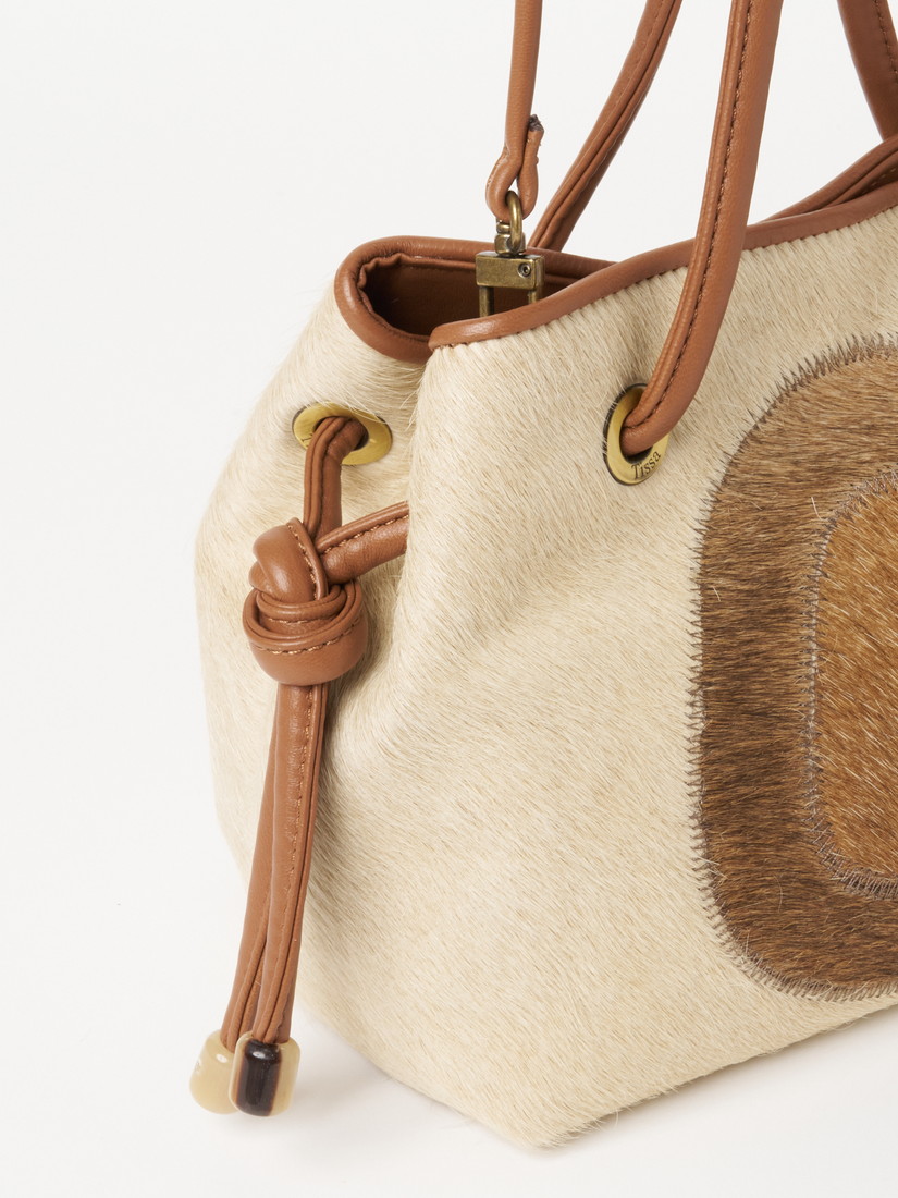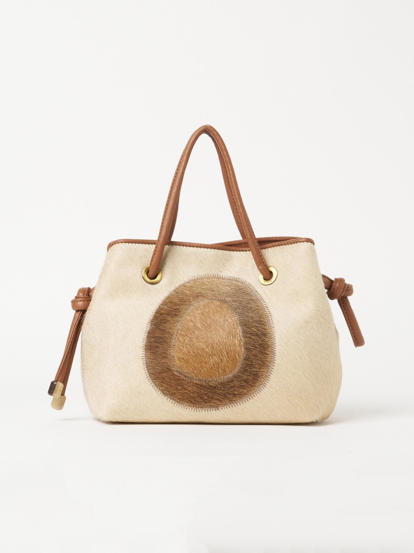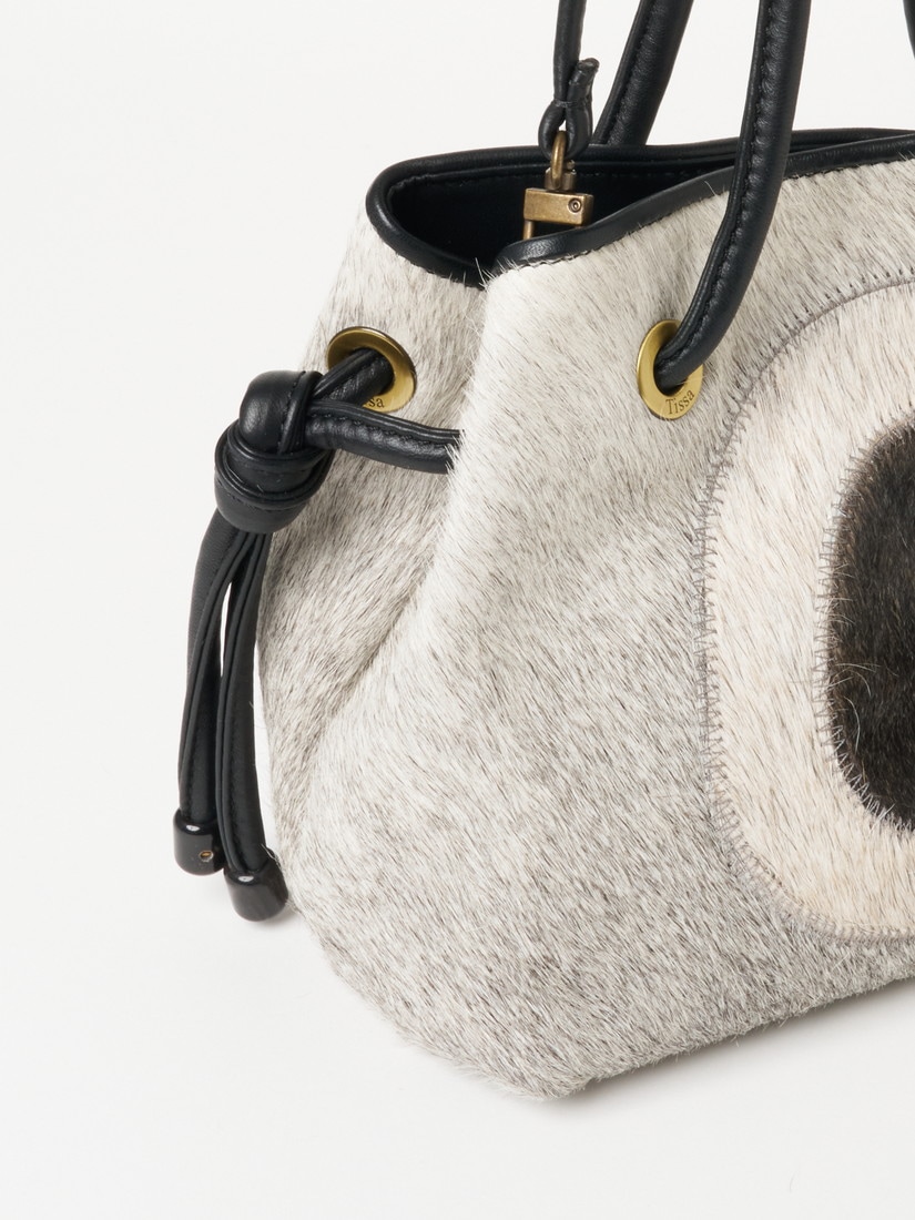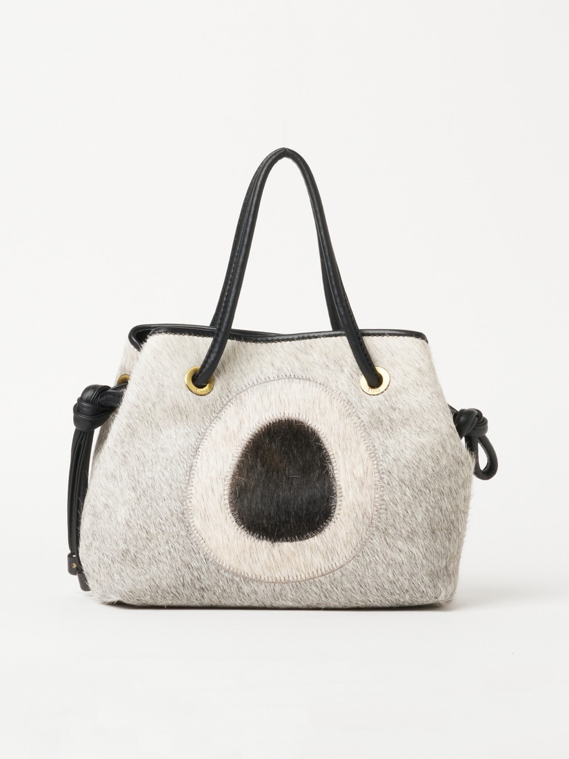 色の異なるハラコをブランドアイコンである「バブル」の形にパッチワークし、人気の"Big Mausi"モデルに落とし込みました。