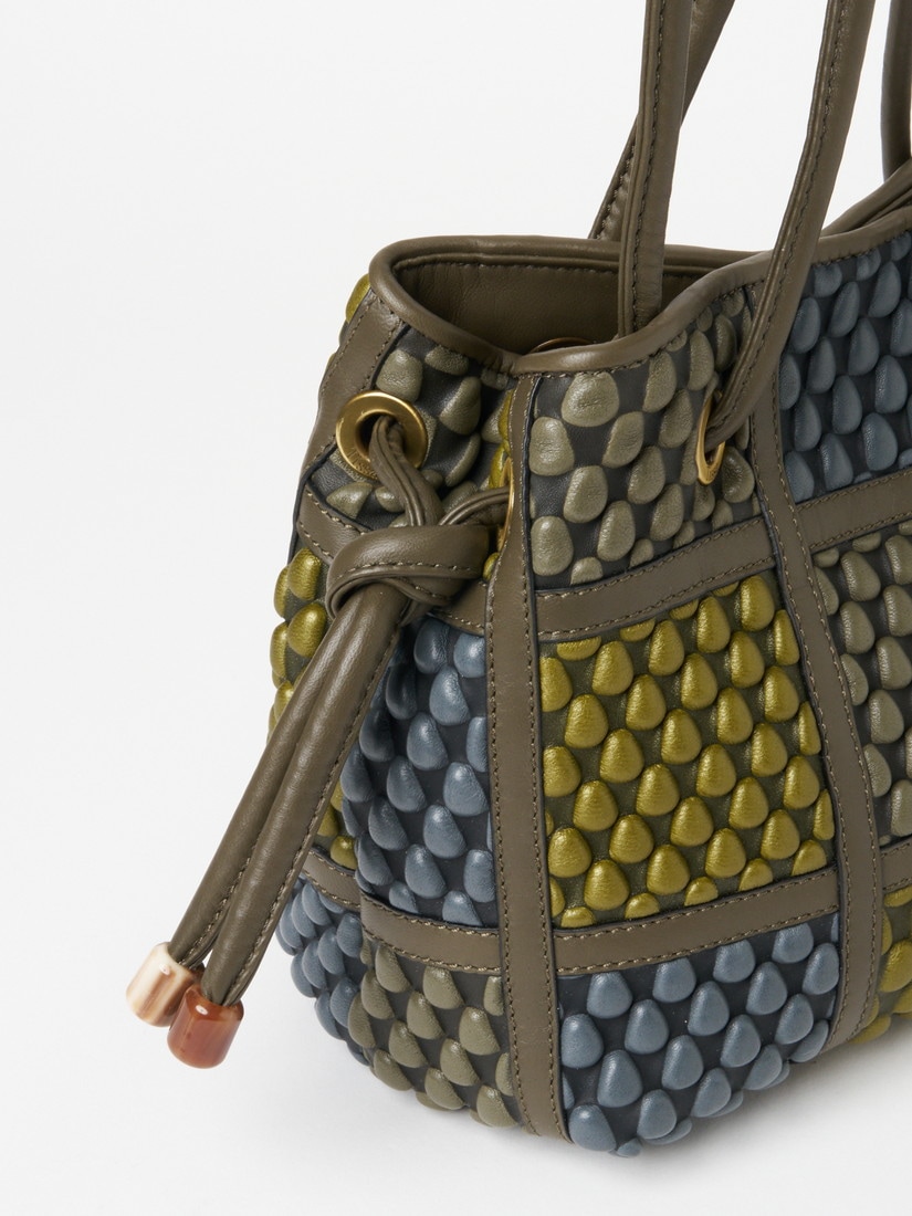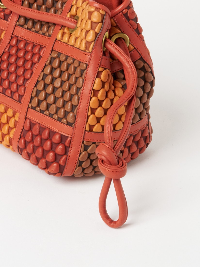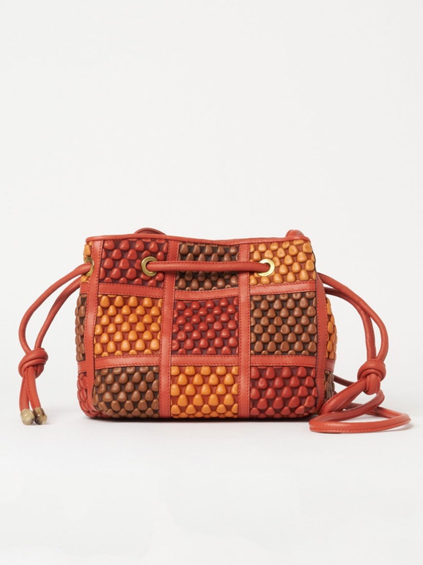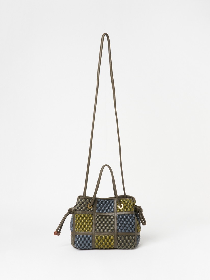 色の異なるハラコをブランドアイコンである「バブル」の形にパッチワークし、人気の"Big Mausi"モデルに落とし込みました。