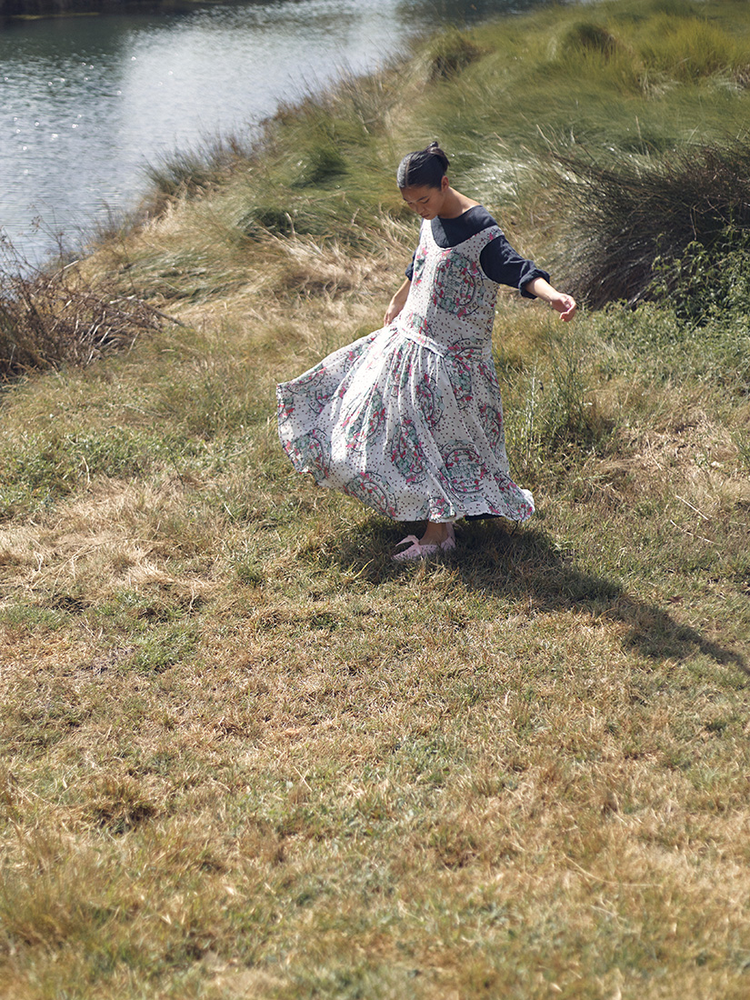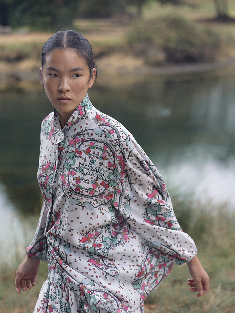 軽やかなテキスタイルのウェアは、動くごとに違う表情を見せ、まるで一枚の服の中で物語が息づいているようです。
